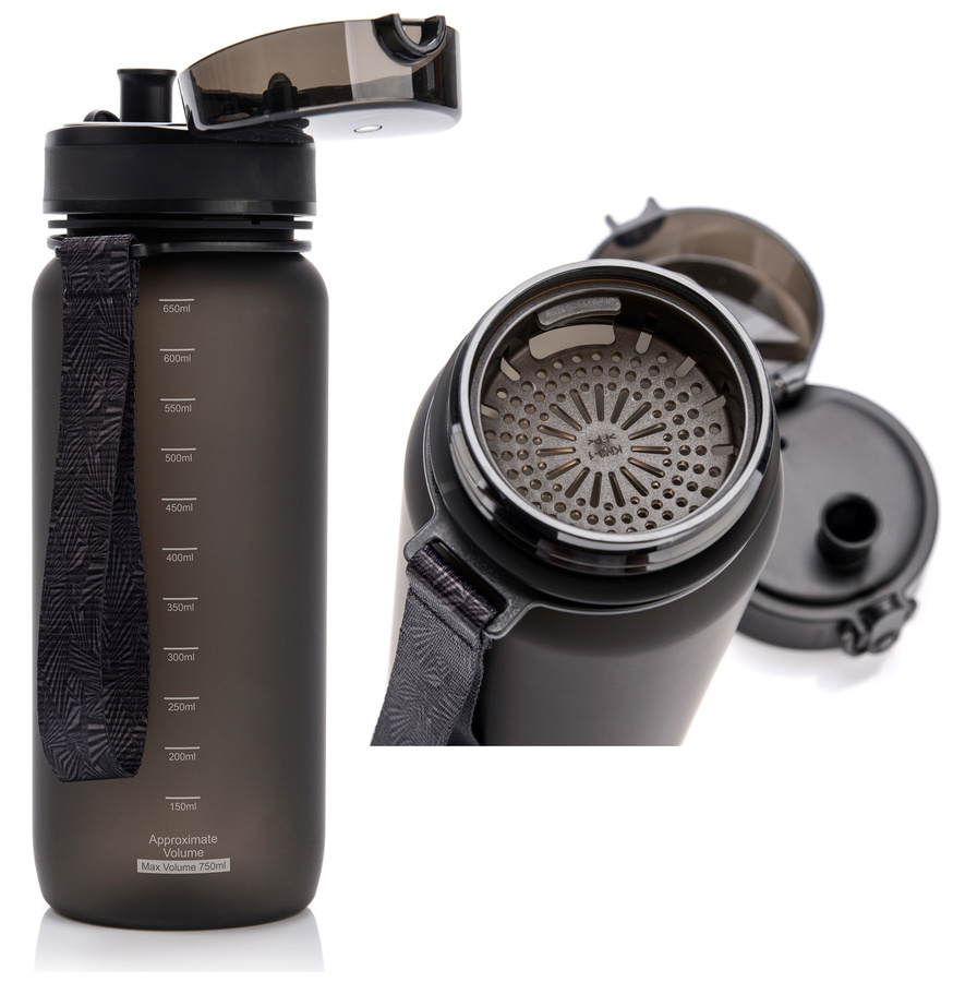 Uniwersalna butelka z matowym wykończeniem i powierzchnią antypoślizgową jest przyjemna w dotyku, a pasek na nadgarstek wygodny podczas codziennego noszenia i ruchu. Bidon został wyposażony w miarkę zachęcającą do regularnego nawadniania. Wyjmowany filtr (np. do owoców, herbaty czy kostek lodu) umożliwia wypełnienie butelki ulubionym napojem, bez obaw o zatkanie ustnika.