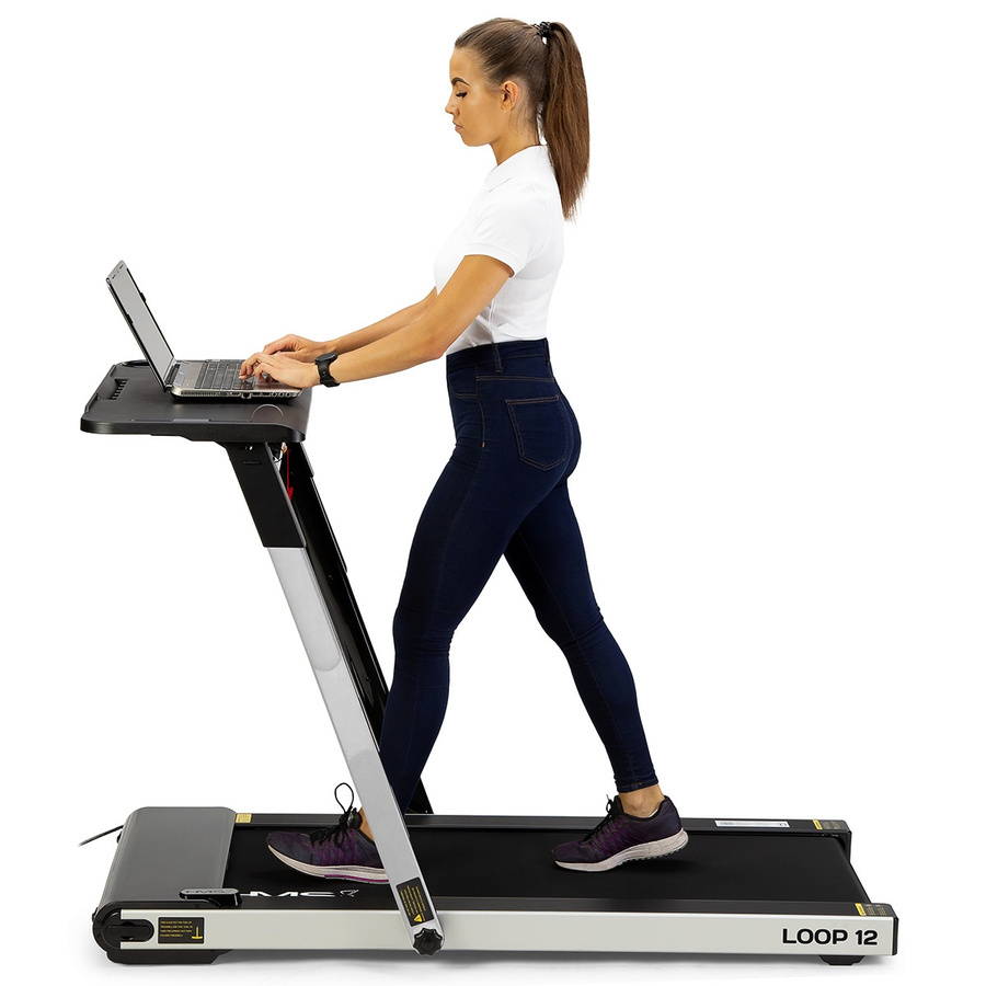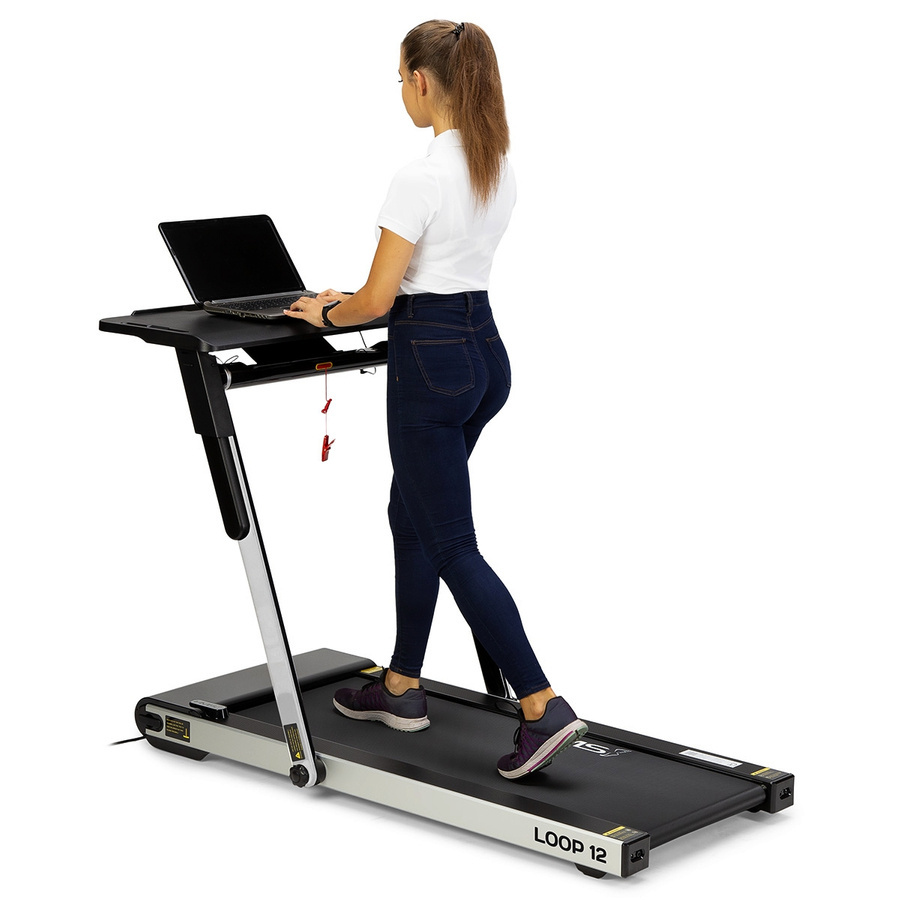Bieżnia LOOP12 MULTI to nowoczesne urządzenie, które pozwala połączyć pracę przy komputerze z aktywnością fizyczną. Dzięki innowacyjnemu stolikowi montowanemu na konsoli, możesz wygodnie maszerować podczas wykonywania codziennych obowiązków. Po jego zdjęciu bieżnia przekształca się w klasyczne urządzenie treningowe do intensywnych ćwiczeń w domu.