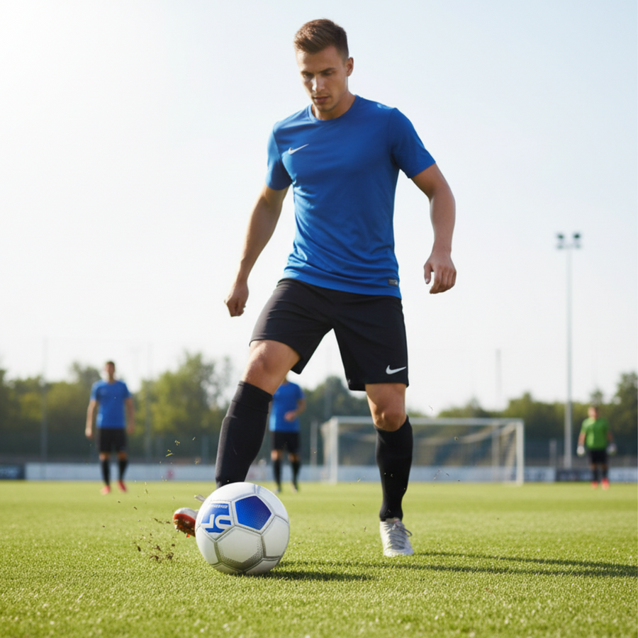 - Kolorystyka: biało-niebieska – dobra widoczność na boisku