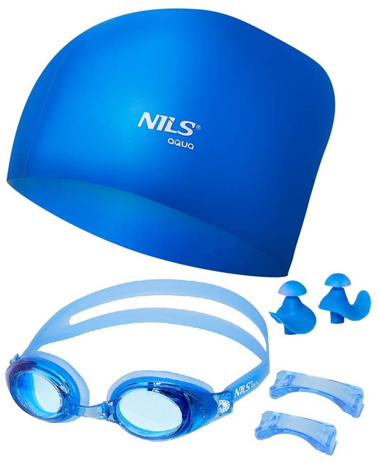 Niebieski Zestaw Pływacki Na Basen Czepek Do Długich Włosów + Okulary + Zatyczki NILS