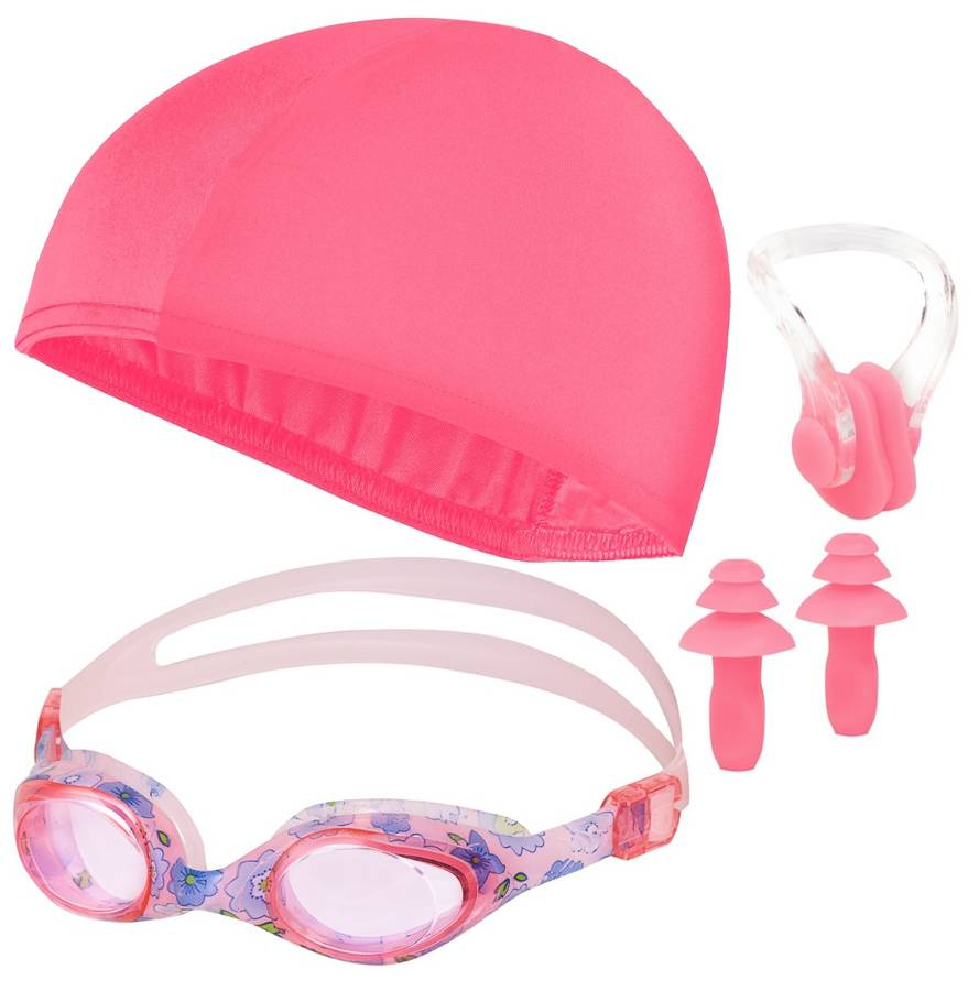 Różowy Zestaw Dla Dziewczynki Na Basen Czepek + Okularki Pływackie + Zatyczki Na Uszy i Nos