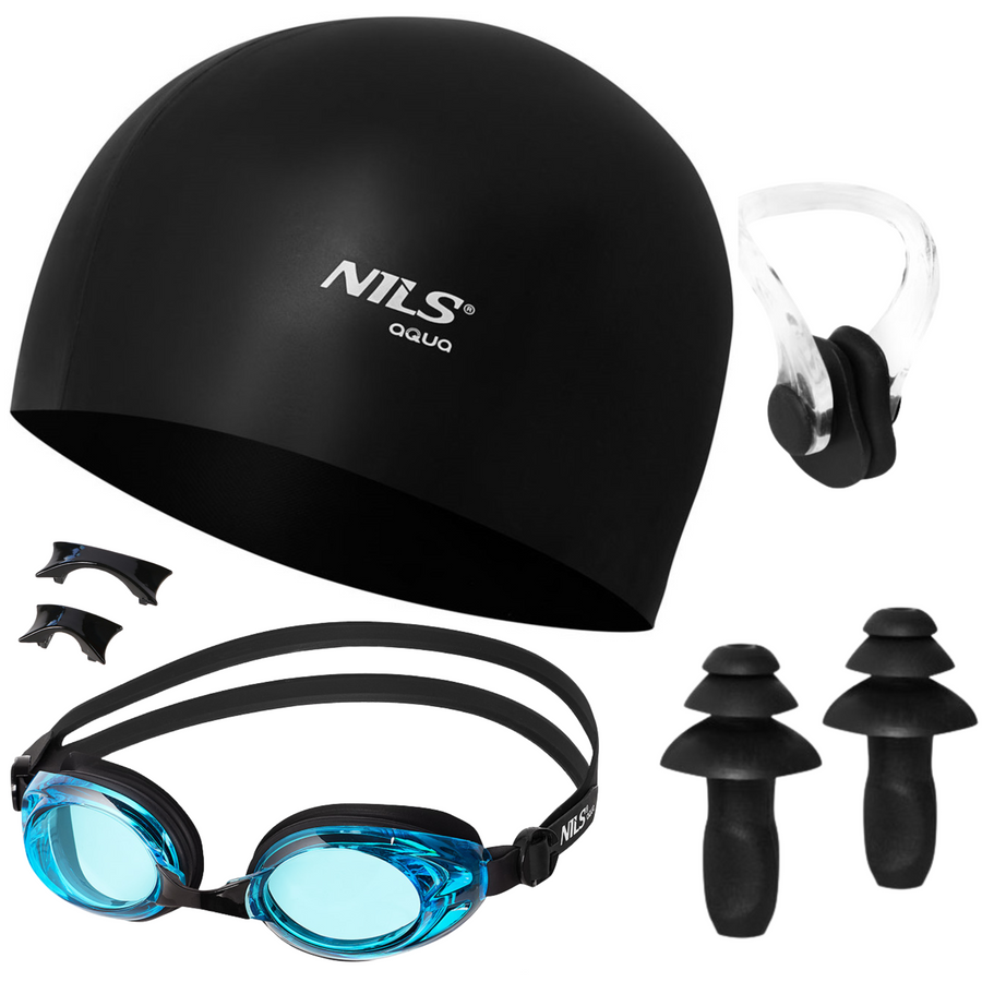 Zestaw Pływacki Na Basen Regulowane Okularki + Czepek + Zatyczki Do Uszu I Nosa NILS
