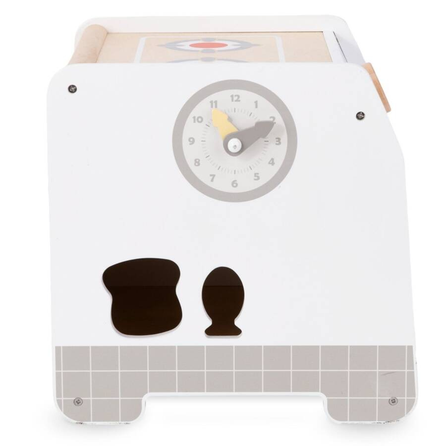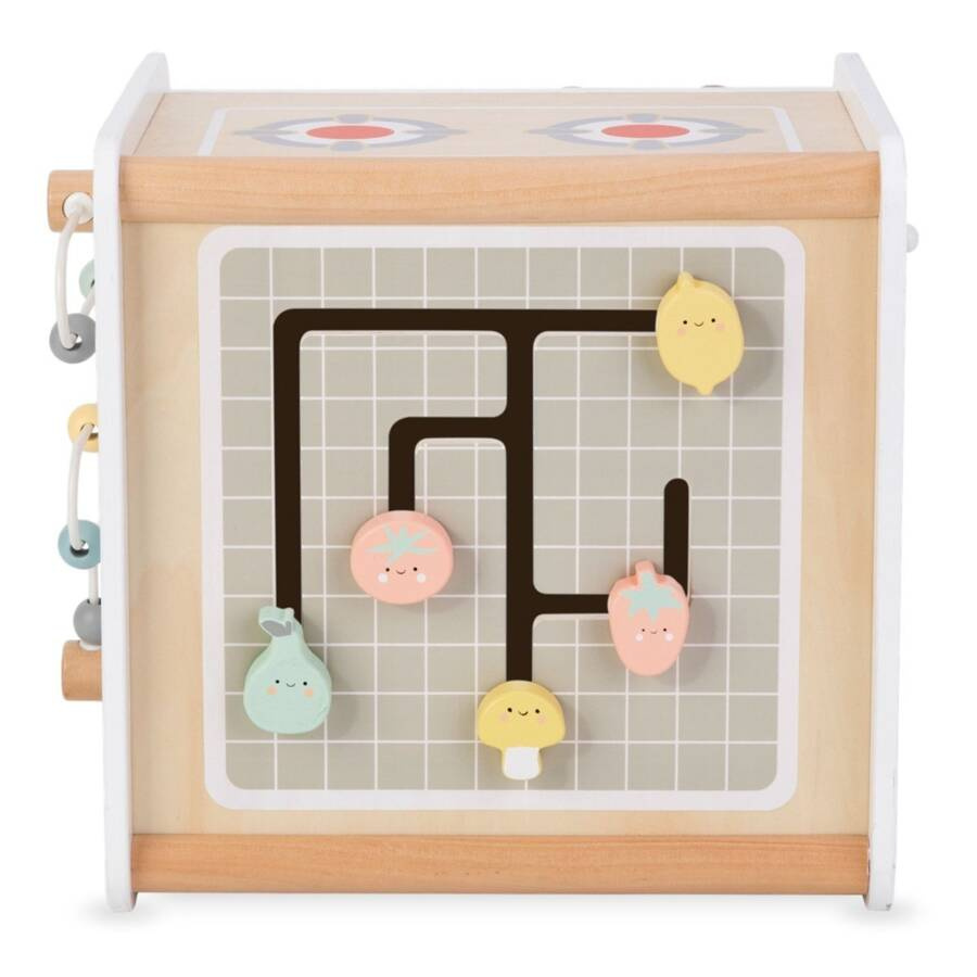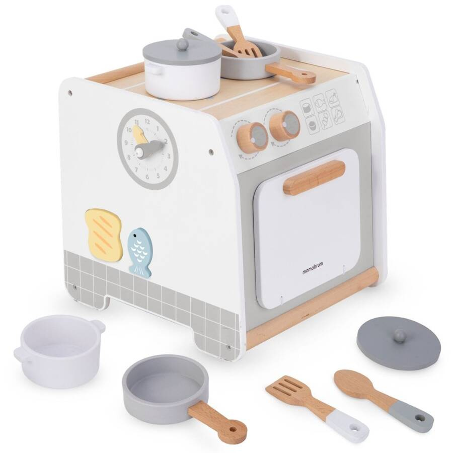 Drewniana kuchnia to gwarancja wielu godzin kreatywnej zabawy! Wyposażona w akcesoria, klikające pokrętła i otwierany piekarnik, stanie się ulubionym miejscem zabaw małych szefów kuchni. Dodatkowe elementy edukacyjne, takie jak pętla motoryczna, labirynt z owocami i warzywami, zegar z ruchomymi wskazówkami czy sorter kształtów, sprawiają, że kuchnia rozwija wyobraźnię, uczy i dostarcza mnóstwo radości.