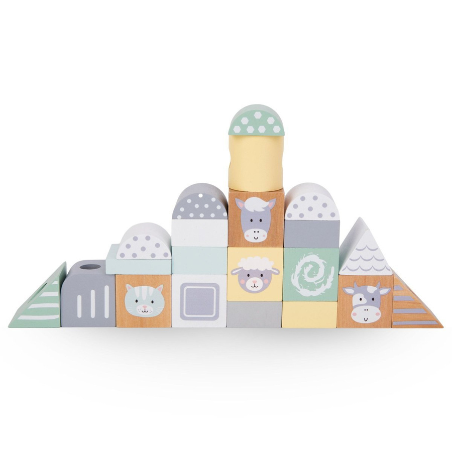 - Kolorowe klocki z motywami farmy: zwierzątka i elementy gospodarstwa rozwijają ciekawość świata.