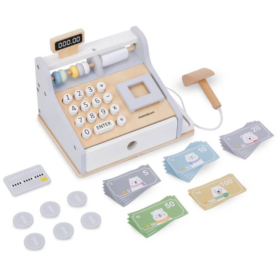 Drewniana kasa fiskalna z akcesoriami – edukacyjna zabawka dla małych kasjerów