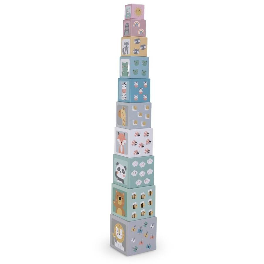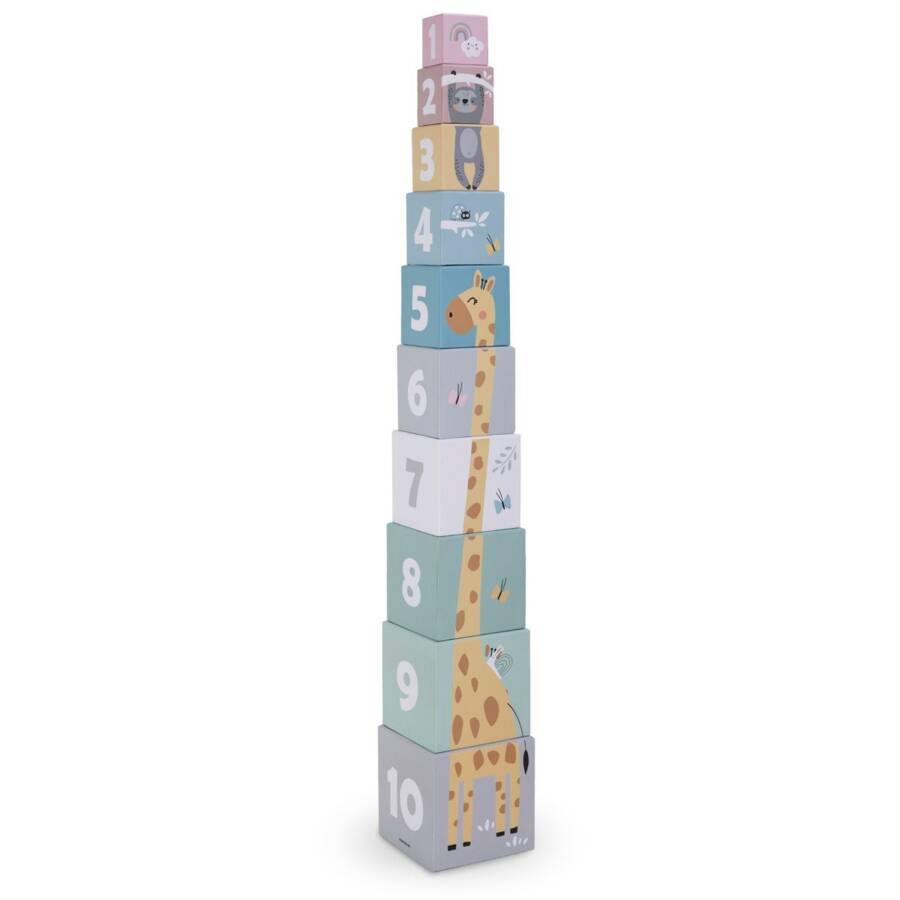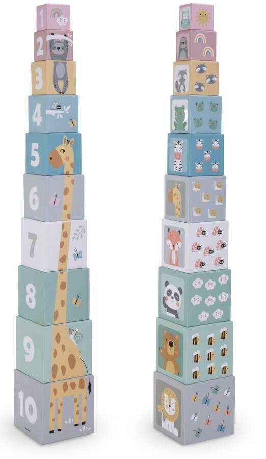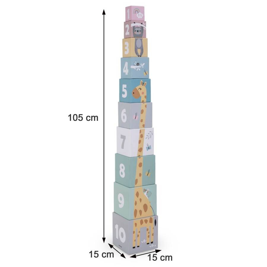 Układanie klocków, a jednocześnie nauka liczenia i rozpoznawania zwierząt? Z wieżą do układania to możliwe! Zestaw składa się z 10 kartonowych kostek o różnej wielkości, które można układać jedna na drugiej, tworząc imponującą wieżę. Po zabawie wystarczy je zburzyć i rozpocząć zabawę od nowa – to aktywność, która nie znudzi się Twojemu dziecku. Każda ścianka ozdobiona została kolorowymi ilustracjami zwierząt oraz cyframi, które wspierają naukę poprzez zabawę.