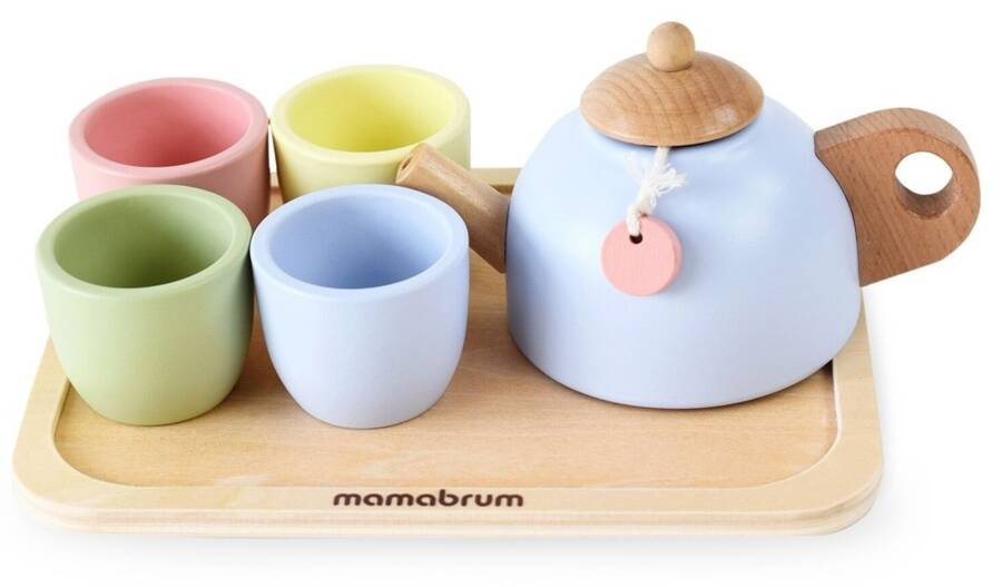 - 7 drewnianych elementów – komplet naczyń i tacka do zabawy w parzenie i serwowanie herbaty.