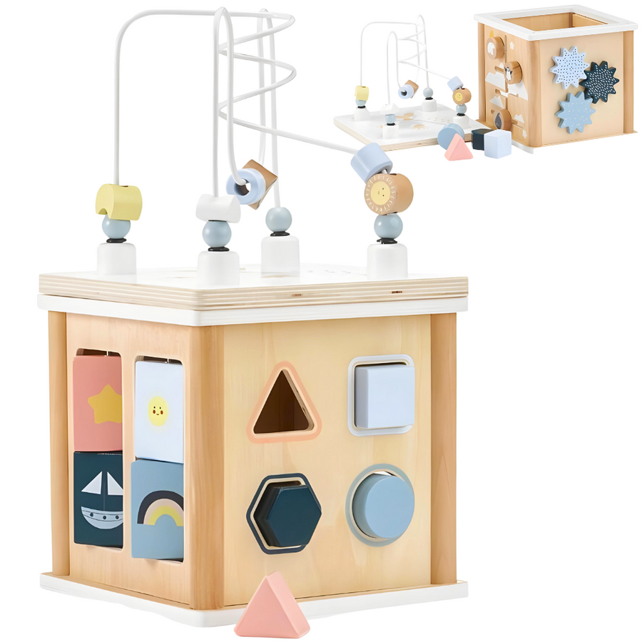 Drewniana kostka edukacyjna to zabawka, która łączy naukę z zabawą, dostarczając dziecku mnóstwo radości i angażujących aktywności. Wyposażona w pętlę motoryczną z kolorowymi koralikami oraz sorter kształtów, szybko stanie się ulubionym centrum zabawy Twojej pociechy. To doskonały wybór dla maluchów już od 12. miesiąca życia!