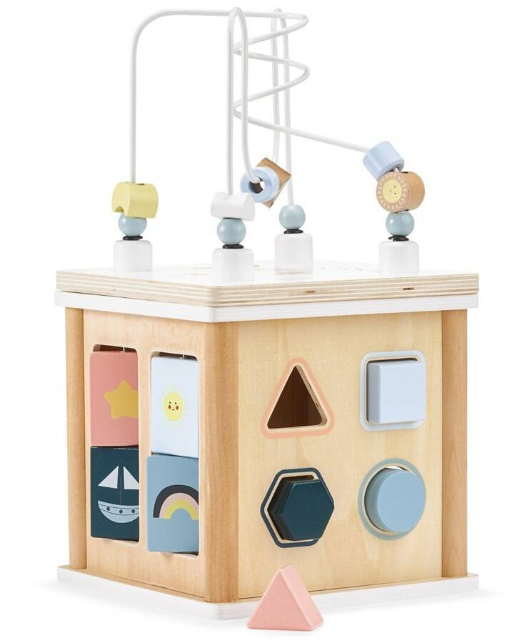 Drewniana kostka edukacyjna z przeplatanką i sorterem kształtów
