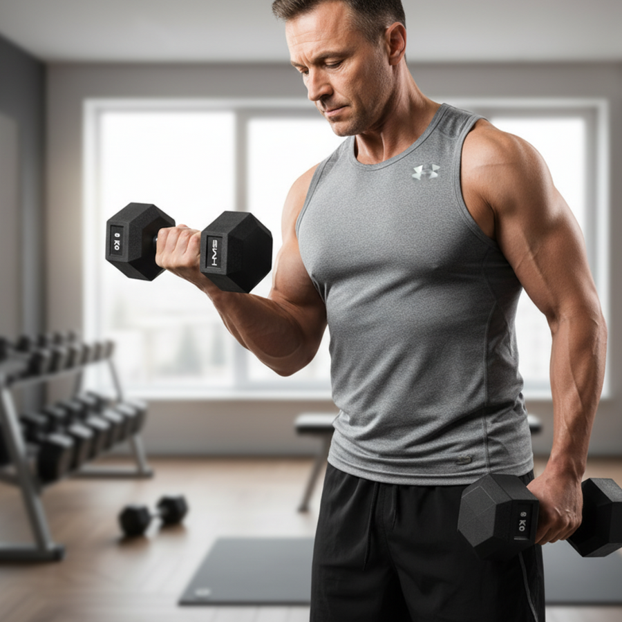 - Bezpieczeństwo – sześciokątny kształt zapobiega toczeniu się hantli po podłożu,