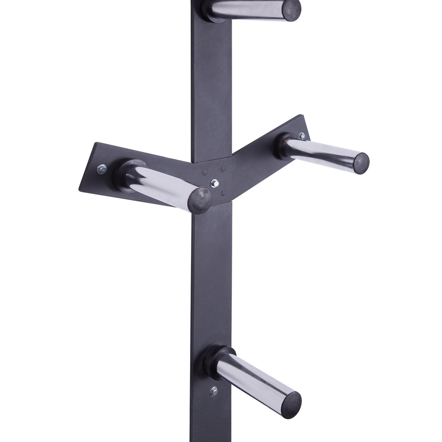 Stojak ma 6 bolców o średnicy 5 cm, dzięki czemu jest kompatybilny z talerzami olimpijskimi oraz większością talerzy dostępnych na rynku.