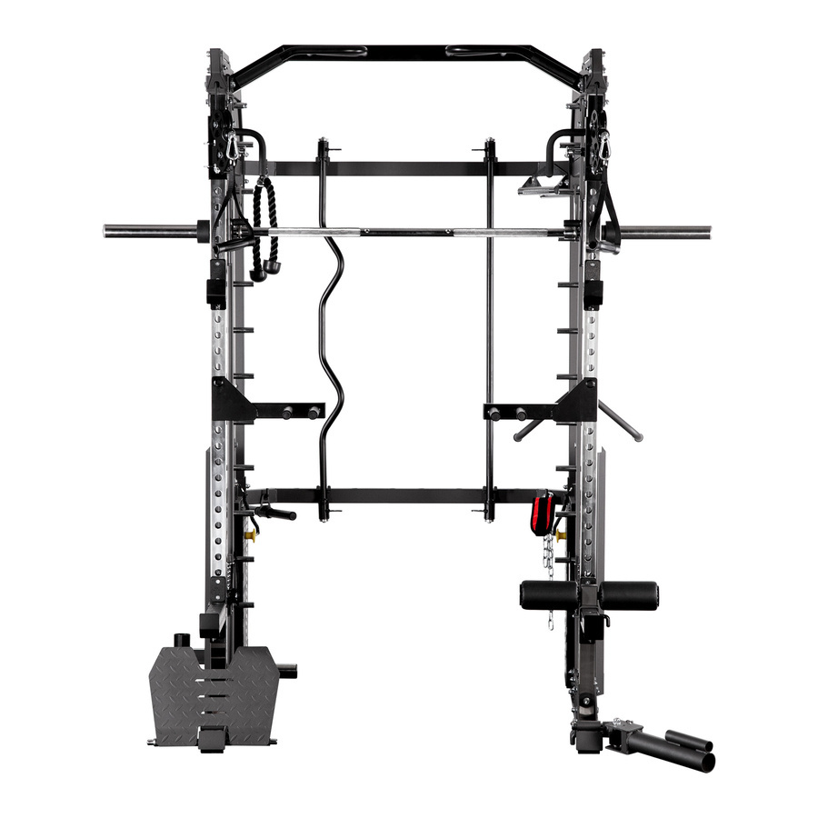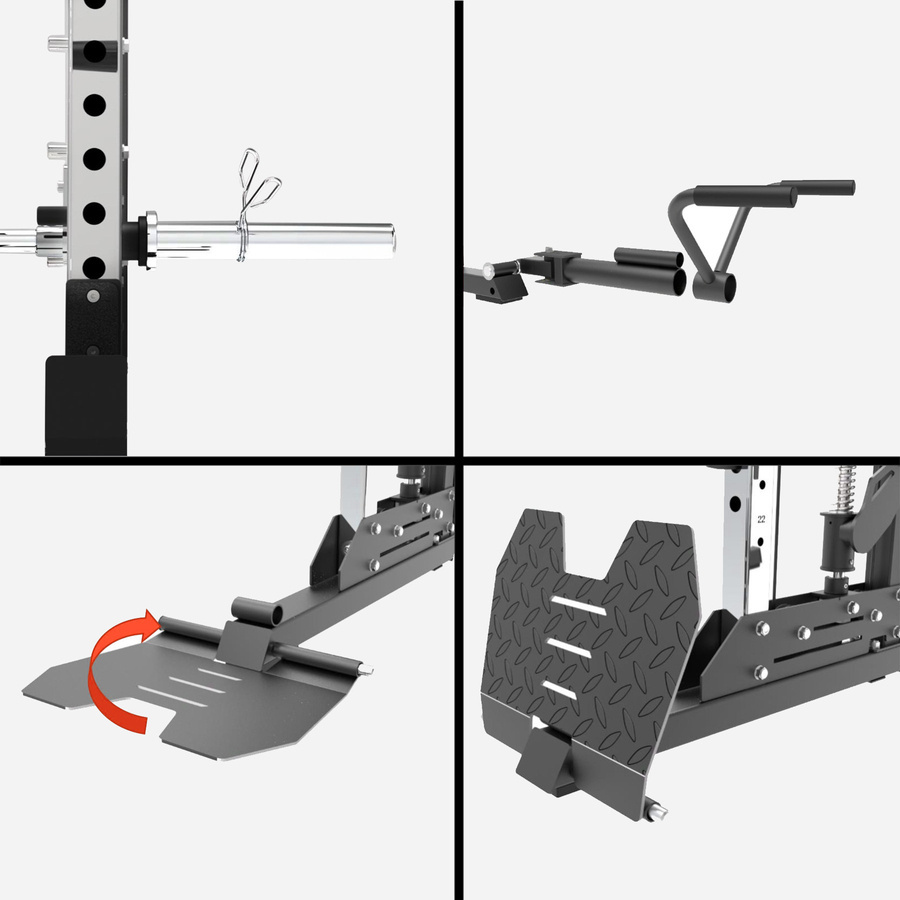 Maszyna wyposażona jest w dwa niezależne stosy obciążeń po 120 kg każdy, z regulacją co 5 kg, co pozwala na precyzyjne dopasowanie obciążenia do poziomu użytkownika. Bogaty zestaw akcesoriów – w tym liczne uchwyty, drążki, poręcz do dipów, jammer arms czy monolift – daje praktycznie nieograniczone możliwości treningowe bez konieczności dokupowania dodatkowego sprzętu.