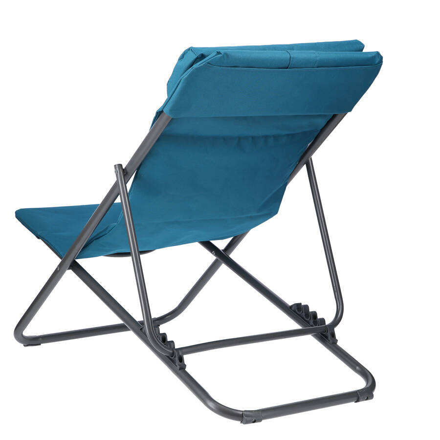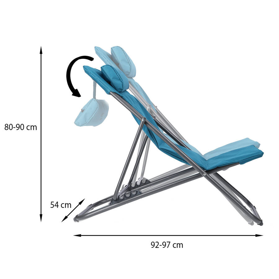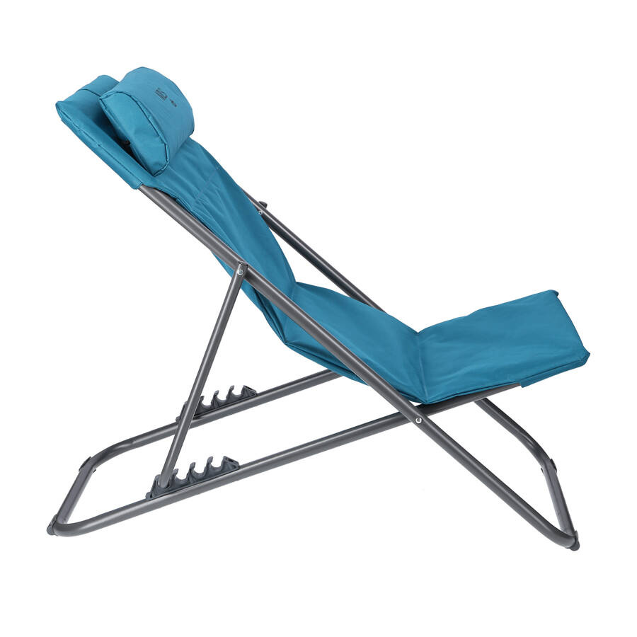 Leżak wyposażony jest w czterostopniowe, regulowane oparcie, które umożliwia wygodne dopasowanie pozycji siedzącej lub półleżącej. Dodatkowo miękka, wyprofilowana poduszka zwiększa wygodę i pozwala na komfortowy wypoczynek przez dłuższy czas.