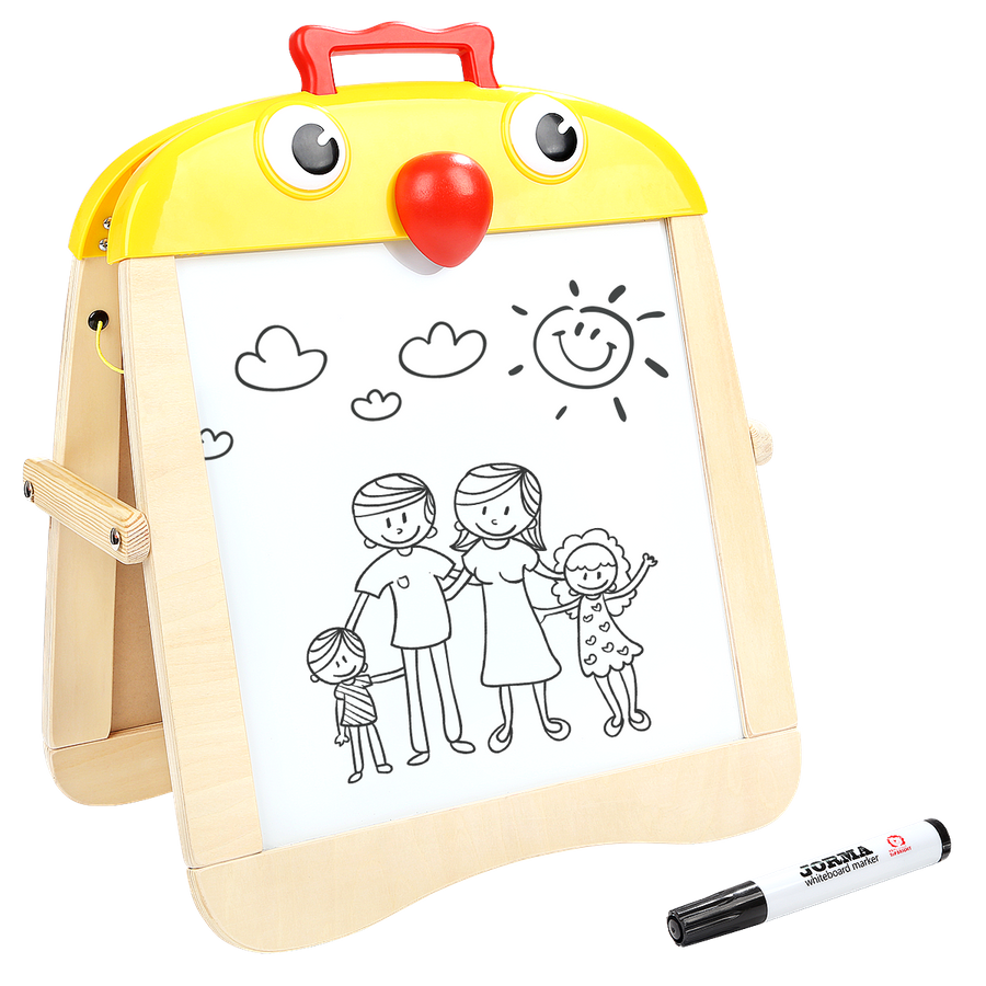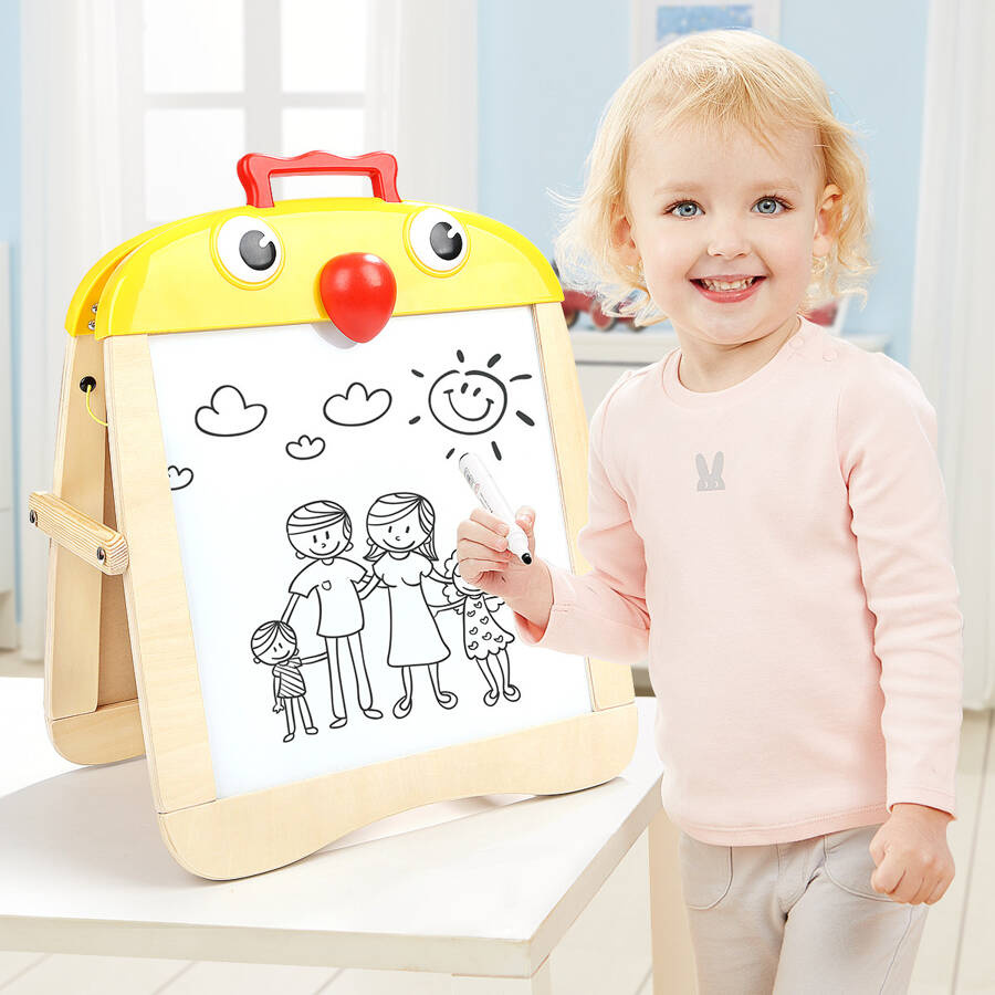Dwustronna tablica magnetyczna TOP BRIGHT to świetne narzędzie edukacyjne i zabawkowe w jednym. Z jednej strony dziecko może rysować kredą, z drugiej – markerem suchościeralnym. Lekka, poręczna i zaprojektowana w uroczym kształcie pisklęcia, zachęca maluchy do twórczej zabawy i nauki. Dzięki dołączonej gąbce w formie dzioba pełniącej funkcję gumki, zabawa jest jeszcze bardziej atrakcyjna i praktyczna.