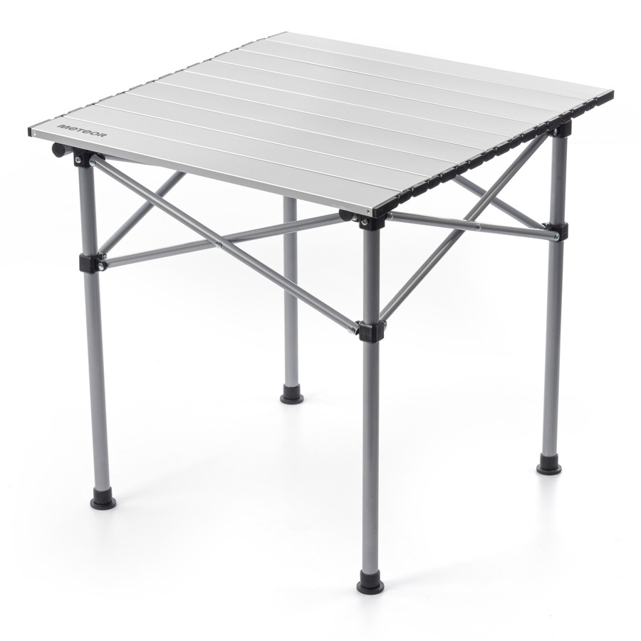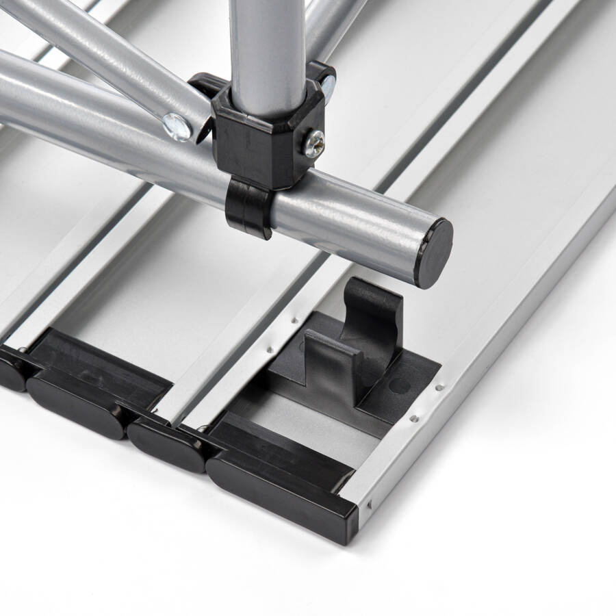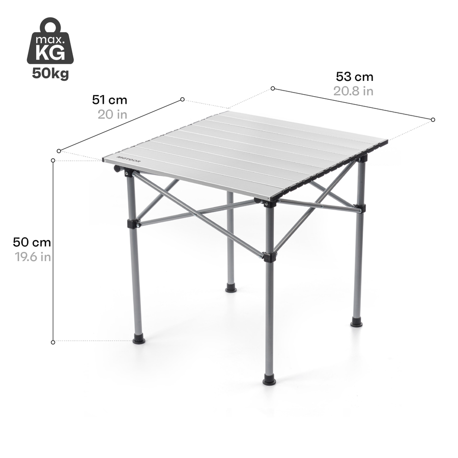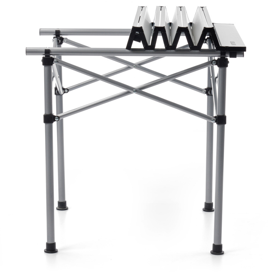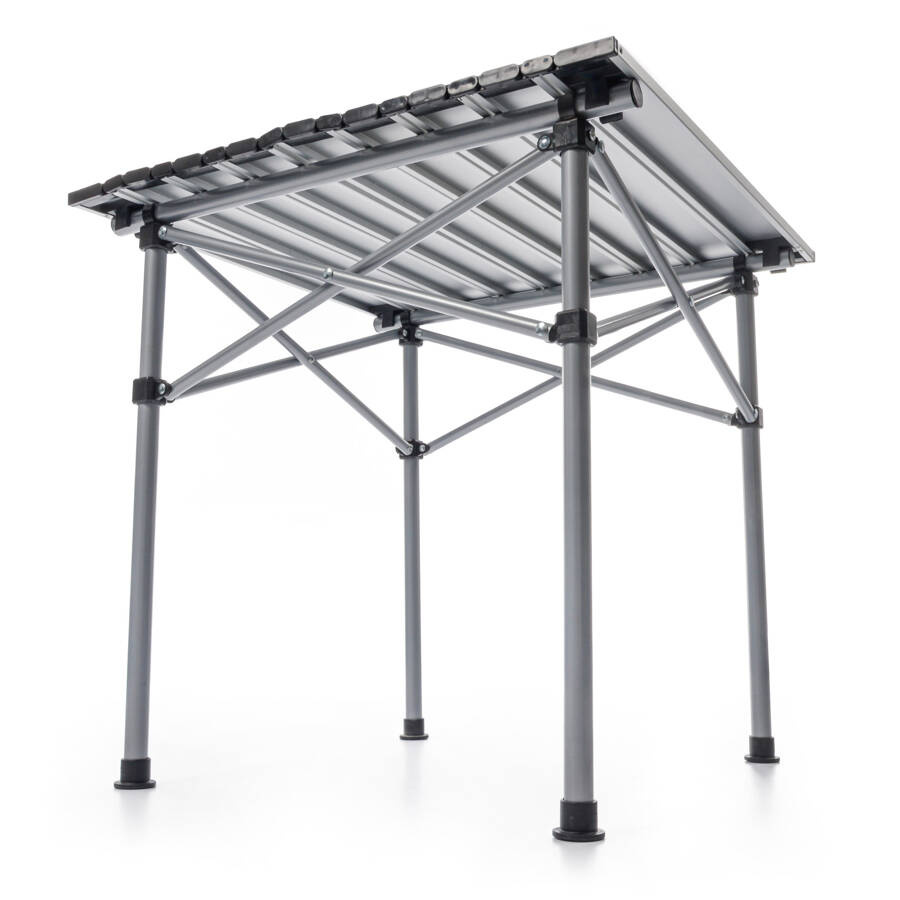 Prosty system składania i rozkładania sprawia, że stół jest gotowy do użycia w kilka chwil – bez użycia narzędzi. Blat składa się z aluminiowych listew połączonych elastyczną taśmą, co pozwala na szybki montaż. Konstrukcja stołu pozwala na obciążenie do 50 kg, co czyni go bardzo funkcjonalnym mimo kompaktowych wymiarów.