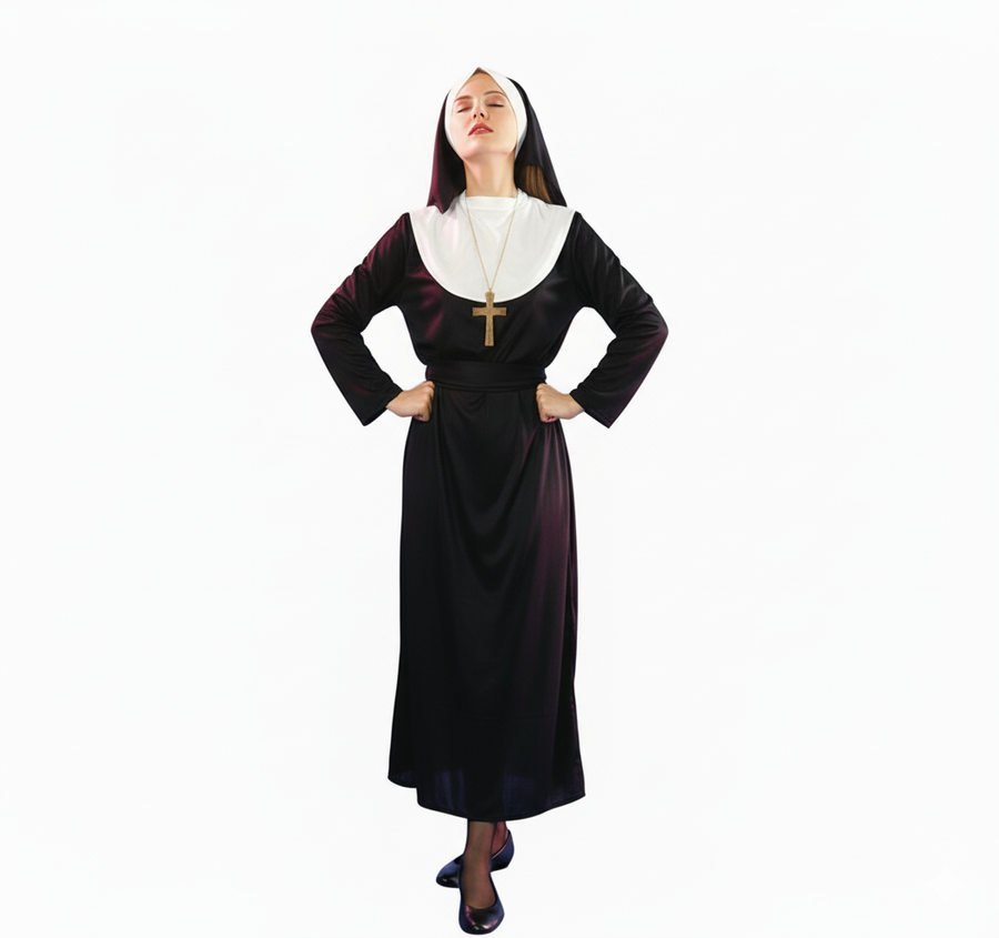Ten kostium zakonnicy to doskonała propozycja dla wszystkich, którzy poszukują stylizacji wiernie odwzorowującej tradycyjny strój zakonny. Skromna, długa suknia z długimi rękawami oraz charakterystyczne nakrycie głowy w formie białego kornetu z czarnym welonem sprawiają, że całość prezentuje się niezwykle realistycznie i z klasą. To idealny wybór na bale przebierańców, spektakle teatralne, jasełka czy inne wydarzenia tematyczne. Kostium jest wygodny w noszeniu i łatwy w zakładaniu, co czyni go praktycznym dodatkiem do każdej garderoby imprezowej.