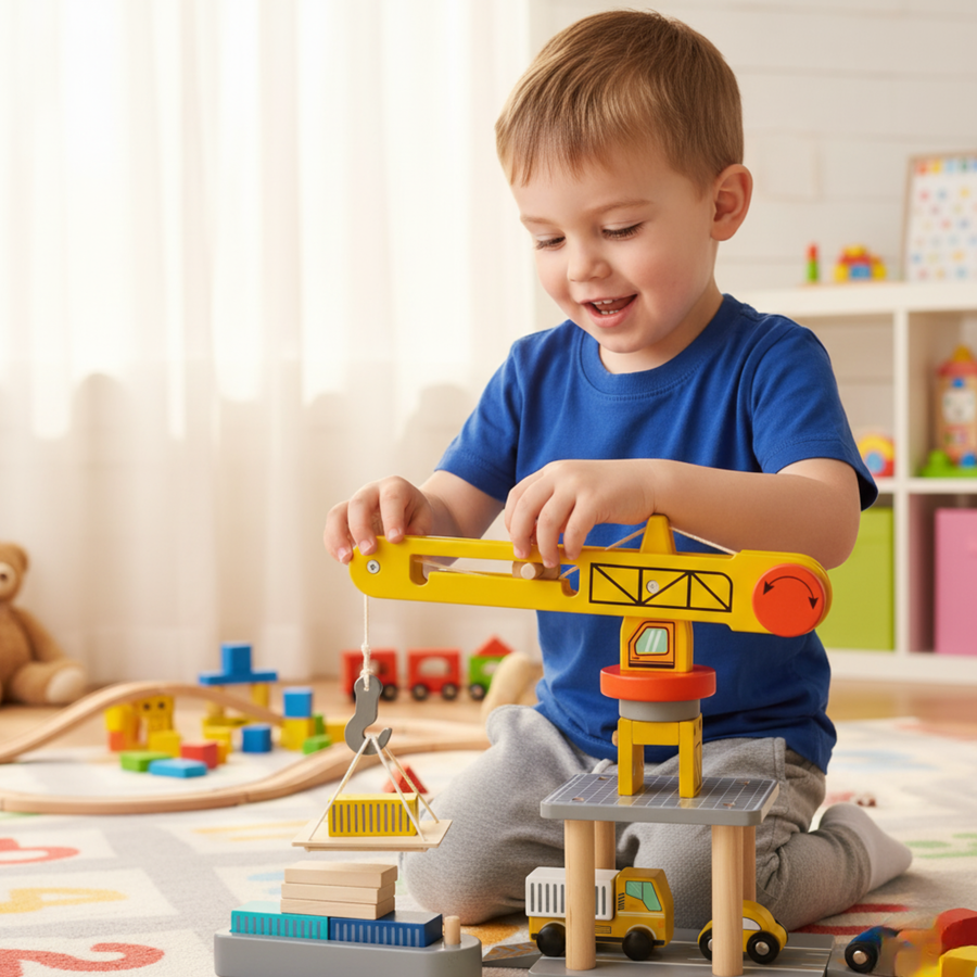 Żuraw został wykonany z trwałego drewna, co gwarantuje bezpieczeństwo oraz długotrwałą zabawę. Kolorowe detale i dopracowane akcesoria sprawiają, że całość wygląda atrakcyjnie i zachęca do kreatywnego odgrywania scenek z życia placu budowy. Zestaw zawiera m.in. ruchomy dźwig, hak oraz pojazdy, dzięki czemu zabawa staje się jeszcze bardziej realistyczna i wciągająca.