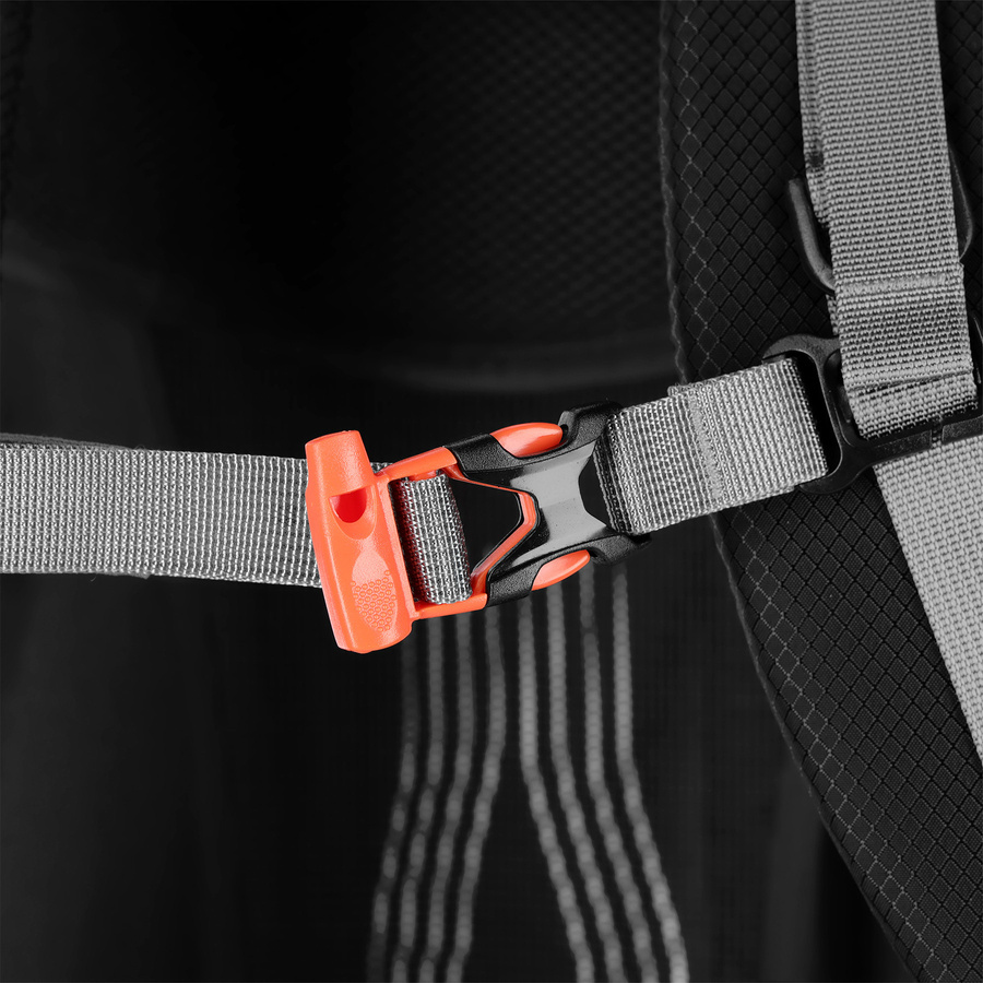 Na klamrze spinającej pas piersiowy umieszczono zintegrowany gwizdek ratunkowy, zwiększający bezpieczeństwo użytkownika. Dodatkowy panel uchwytów pozwala na zamocowanie np. kijków trekkingowych lub innych akcesoriów. Plecak posiada również dwie kieszenie boczne z siatki oraz kieszenie na zamek w pasie biodrowym, idealne na telefon czy inne drobne przedmioty.