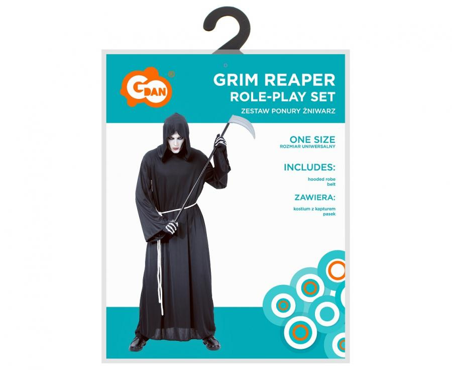 - Długi czarny kostium: sięgający do ziemi, z szerokimi rękawami i dużym kapturem – idealny do kreowania postaci mrocznego żniwiarza