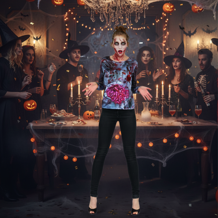 Ta koszulka z długim rękawem z realistycznym nadrukiem wnętrzności to doskonały wybór dla fanów mrocznych i kreatywnych stylizacji. Stanowi efektowne dopełnienie przebrania zombie lub innej postaci rodem z horroru. Wzór przyciąga uwagę i nadaje kostiumowi niepowtarzalnego charakteru – idealnie wpisuje się w klimat Halloween, karnawału lub imprez tematycznych.