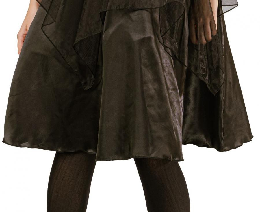 Sukienka ma długość do kolan, warstwowy krój i prześwitujące elementy, co nadaje jej elegancji i tajemniczości.