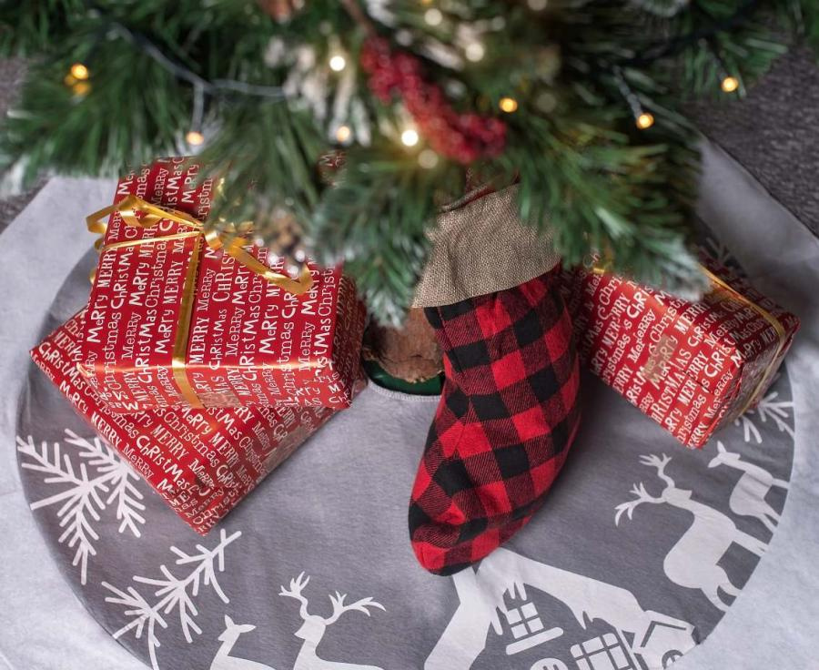 Chroni podłogę, dodaje elegancji, wprowadza świąteczny klimat i porządkuje przestrzeń wokół choinki.
