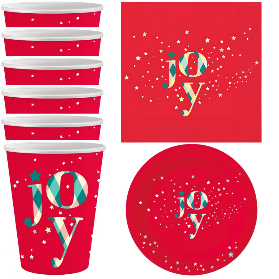 Zestaw obejmuje 6 talerzyków, 6 kubeczków i 20 serwetek – wszystkie z motywem „JOY”.