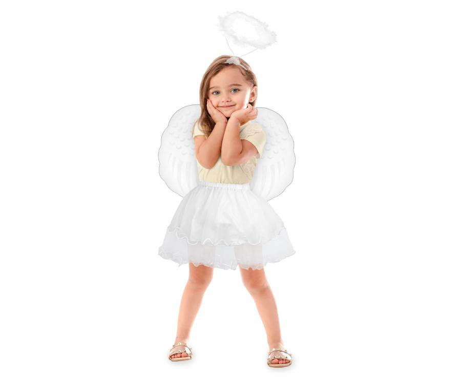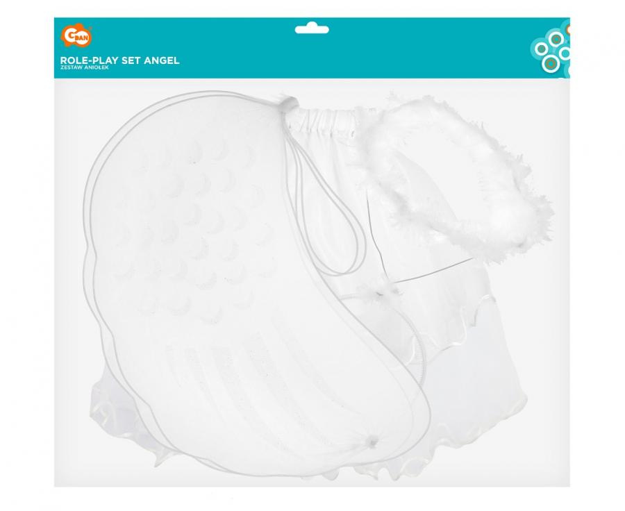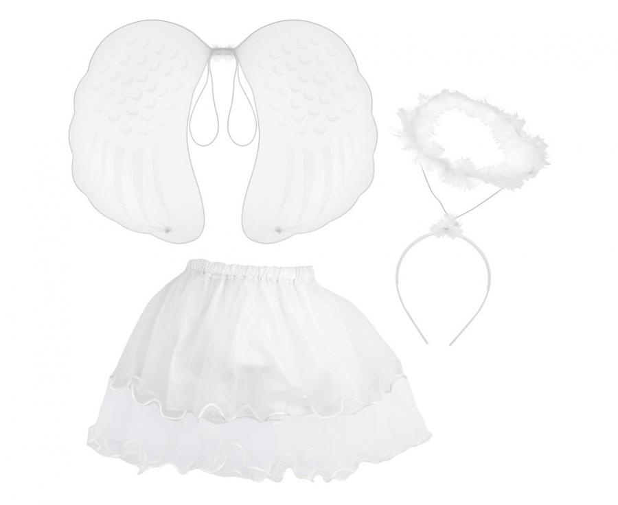 W komplecie znajdują się skrzydła, spódniczka oraz aureolka na opasce.