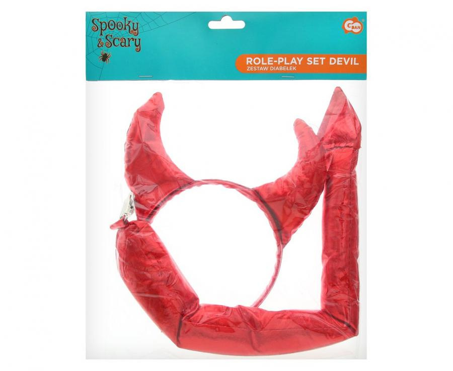 - Kompletny zestaw – zawiera opaskę z czerwonymi rogami oraz długi ogon ze szpiczastym zakończeniem.
