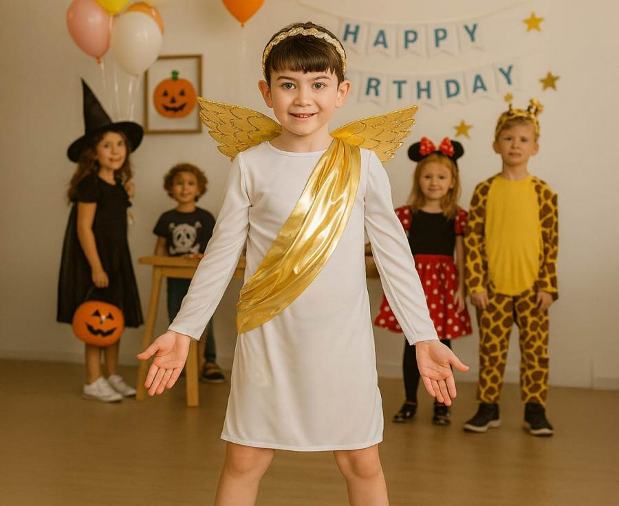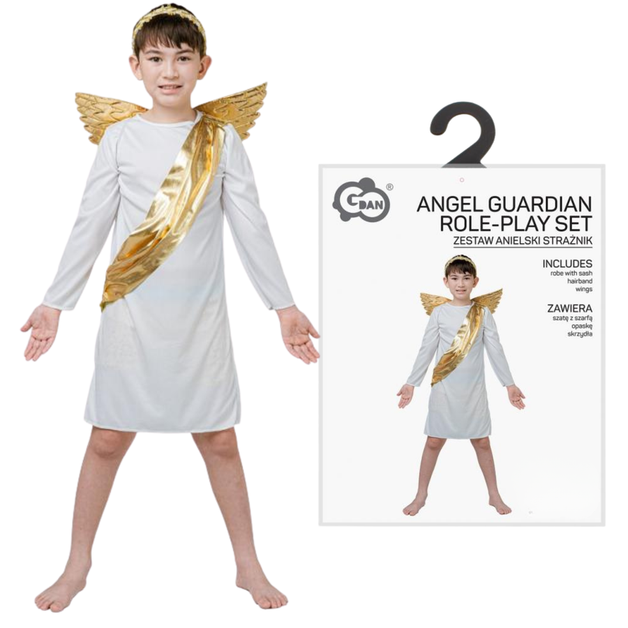 Elegancki strój anielski „Strażnik” to idealny wybór na przedstawienia, jasełka, bale przebierańców i uroczystości szkolne. Ten wyjątkowy kostium łączy w sobie czystość bieli i blask złota, tworząc anielski wizerunek pełen wdzięku i spokoju. Dzięki starannemu wykonaniu i efektownym detalom, dziecko z łatwością wcieli się w rolę anioła opiekuna lub strażnika nieba.