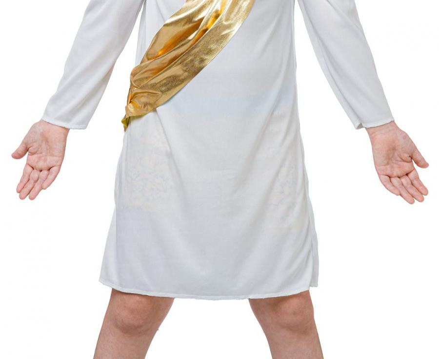 Strój składa się z białej szaty z błyszczącą złotą szarfą, skrzydeł oraz złotej opaski, które razem tworzą spójną, anielską stylizację. Lekki, miękki materiał zapewnia pełen komfort noszenia, a złote dodatki pięknie połyskują w świetle, nadając całości wyjątkowo uroczystego charakteru. To doskonały wybór zarówno do szkolnych występów, jak i świątecznych przedstawień.
