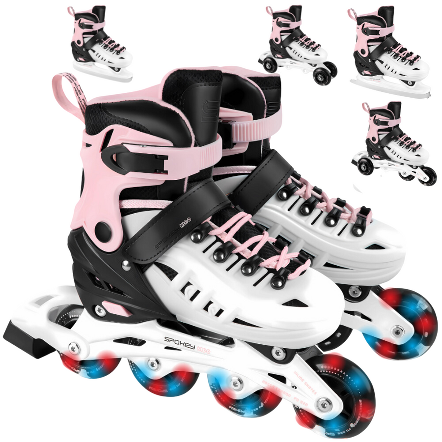Łyżworolki dziecięce Spokey KIDO to wyjątkowy model 5w1, który łączy w sobie funkcje rolek, łyżew, wrotek, rolko-wrotek, a teraz także łyżwy figurowe! To doskonały wybór dla dzieci, które chcą czerpać radość z różnych form aktywności fizycznej na świeżym powietrzu i lodowisku, jednocześnie zachwycając wszystkich unikalnym designem z kółkami LED.