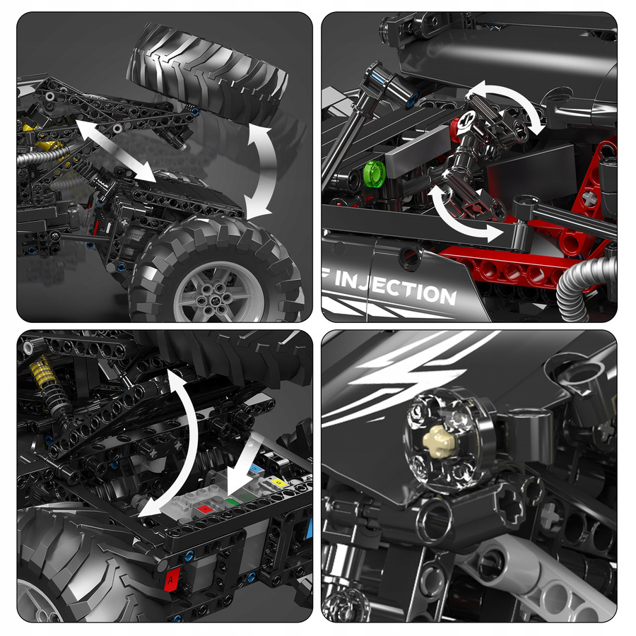 Model o długości 41 cm został zaprojektowany z myślą o wytrzymałości i wydajności. Wyposażony w ogromne koła terenowe, amortyzatory oraz niezależne zawieszenie – wygląda jak gotowy na każdą przeszkodę. Każdy etap składania to okazja, by zgłębić mechanikę pojazdów terenowych – od funkcjonalnej kierownicy po miejsce na akumulator i koło zapasowe.