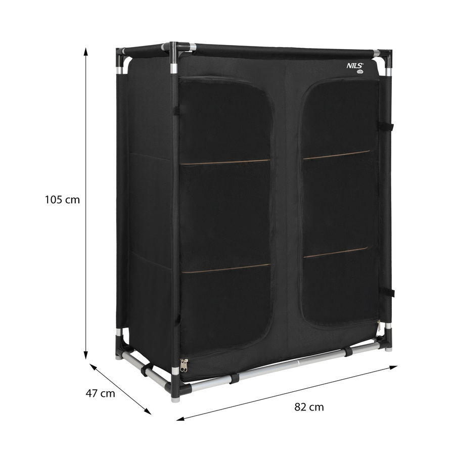 Trzy poziomy przechowywania z sztywnymi półkami pozwalają na wygodne ułożenie ubrań, kosmetyków, żywności lub drobnego sprzętu. Przewiewna siatka i zamki błyskawiczne na drzwiach chronią zawartość przed owadami i zapewniają dobrą wentylację. Stabilny stelaż i szybki montaż sprawiają, że szafka jest praktycznym i niezawodnym meblem na każdy wyjazd.