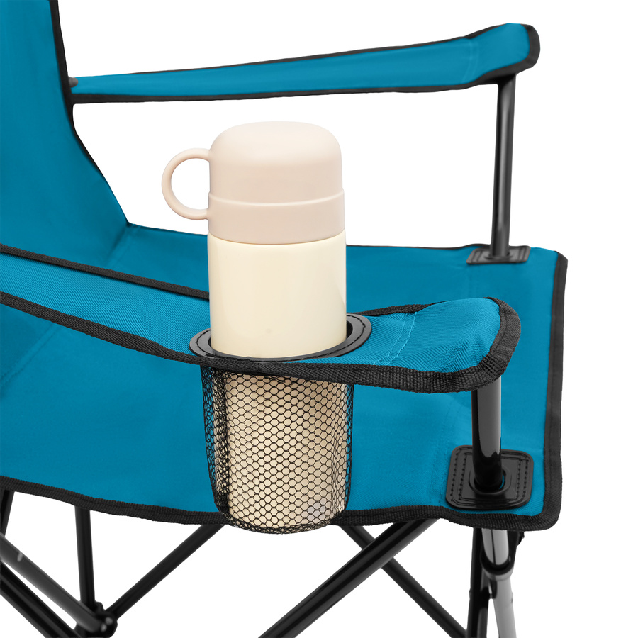 Wbudowany uchwyt na napój w podłokietniku oraz boczny stolik z miejscem na butelkę lub kubek podnoszą komfort użytkowania – nie musisz sięgać do plecaka czy schładzać napoju w trawie. Idealne rozwiązanie dla tych, którzy cenią wygodę i porządek w jednym miejscu.