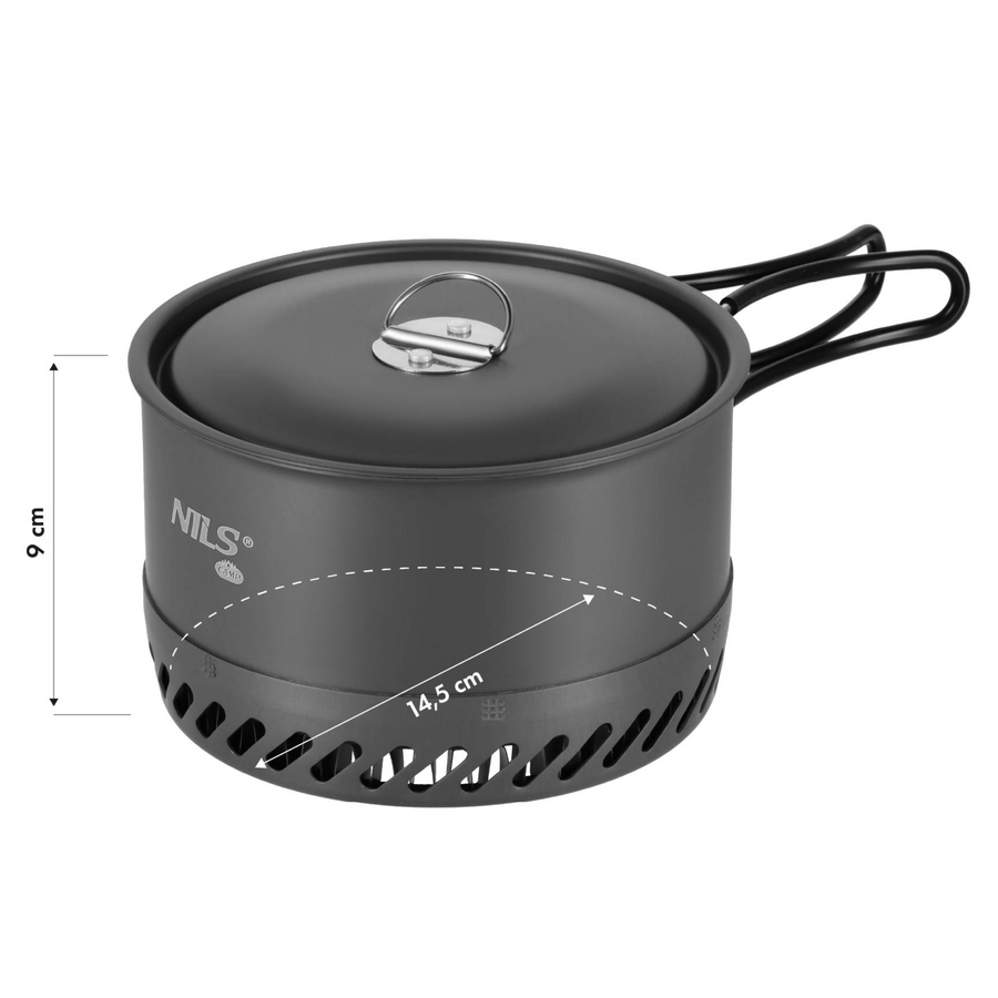 Wykonany z anodowanego aluminium, szybko się nagrzewa i charakteryzuje się wysoką odpornością na uszkodzenia. Dodatkowy radiator u podstawy poprawia efektywność gotowania, rozprowadzając ciepło równomiernie. Składane uchwyty z silikonową osłoną zapewniają bezpieczeństwo i komfort użytkowania, a kompaktowe wymiary pozwalają bez problemu zmieścić go w plecaku.