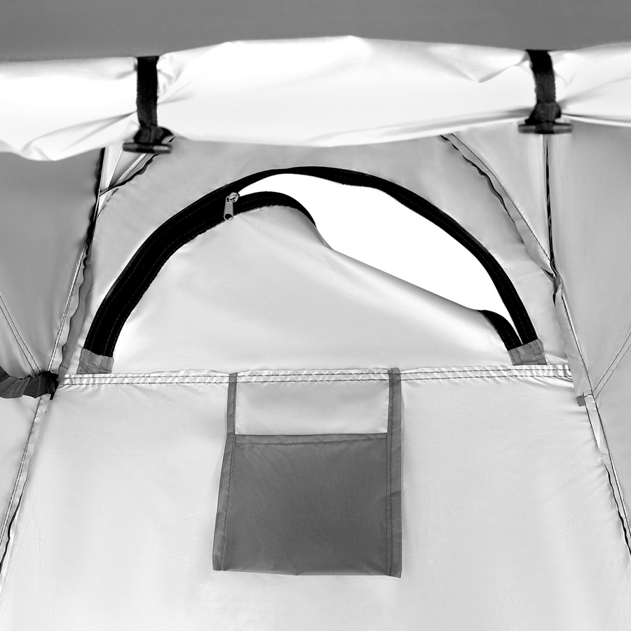 Wbudowane okno i otwór dachowy umożliwiają wentylację oraz korzystanie z przenośnego prysznica. W środku znajdziesz praktyczną kieszeń oraz pasek na ręcznik lub ubrania. Brak podłogi sprawia, że kabina doskonale sprawdza się przy użytkowaniu z wodą. Po zakończeniu użytkowania wystarczy złożyć namiot i schować go do dołączonego pokrowca z uchwytem.