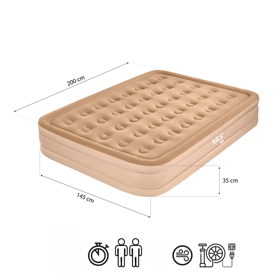 Dzięki dużym wymiarom 200 × 145 × 35 cm zapewnia komfortowy sen dla dwóch osób. Podwyższona wysokość chroni przed chłodem i nierównościami terenu. Dołączona pompka elektryczna umożliwia szybkie pompowanie i wypuszczanie powietrza, co ułatwia obsługę i przechowywanie materaca.