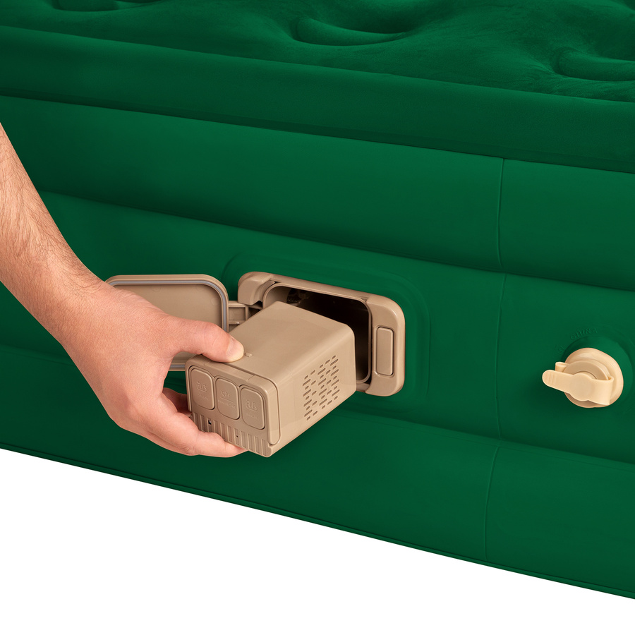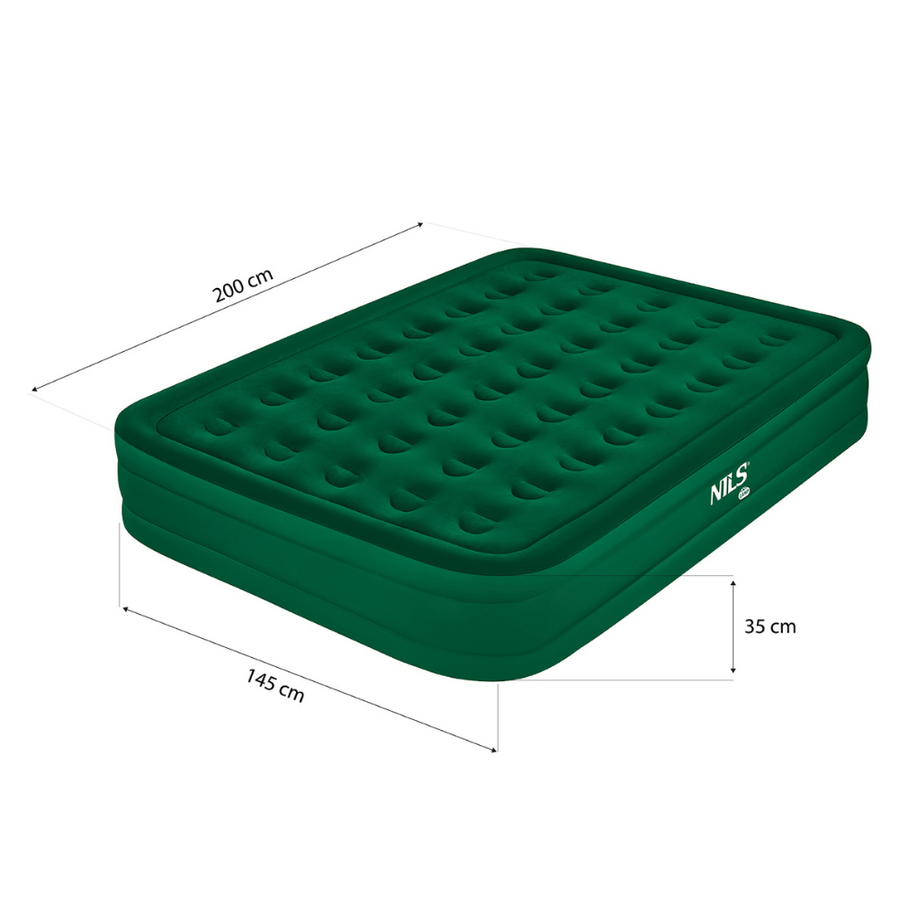 Dzięki dużym wymiarom 200 × 145 × 35 cm zapewnia komfortowy sen dla dwóch osób. Podwyższona wysokość chroni przed chłodem i nierównościami terenu. Dołączona pompka elektryczna umożliwia szybkie pompowanie i wypuszczanie powietrza, co ułatwia obsługę i przechowywanie materaca.