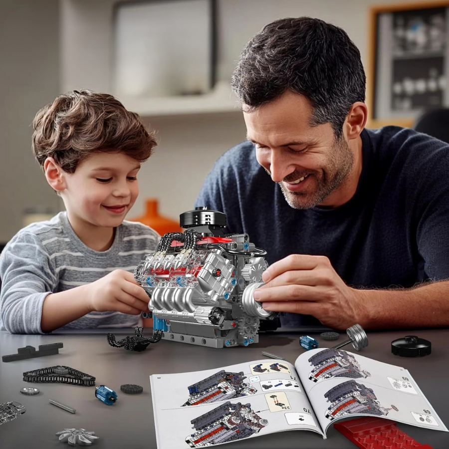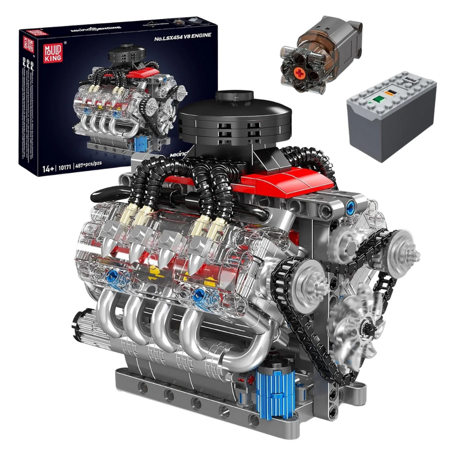 Zestaw konstrukcyjny Mould King 10171 pozwala zbudować w pełni funkcjonalny model silnika V8 w wersji LSX454. To doskonała propozycja dla fanów motoryzacji i modelarstwa – zarówno młodszych, jak i starszych. Model składa się z 487 elementów i zawiera silnik elektryczny, który wprawia w ruch tłoki, wał korbowy, zawory i inne elementy mechaniczne. Transparentna głowica cylindra umożliwia podgląd działania silnika w czasie rzeczywistym, a odwzorowany układ turbo i kolektory wydechowe nadają realizmu całej konstrukcji.