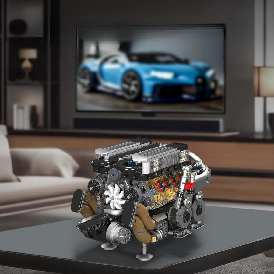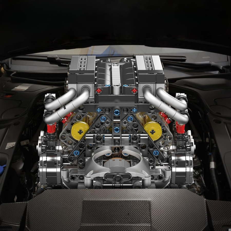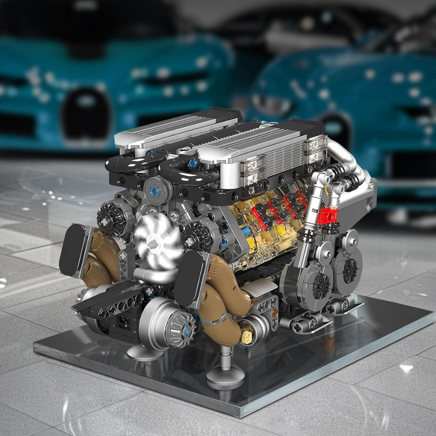 Komplet ponad 950 klocków, silnik XL, akumulator, turbo, instrukcję składania i realistyczne detale odwzorowujące pracę silnika W16.