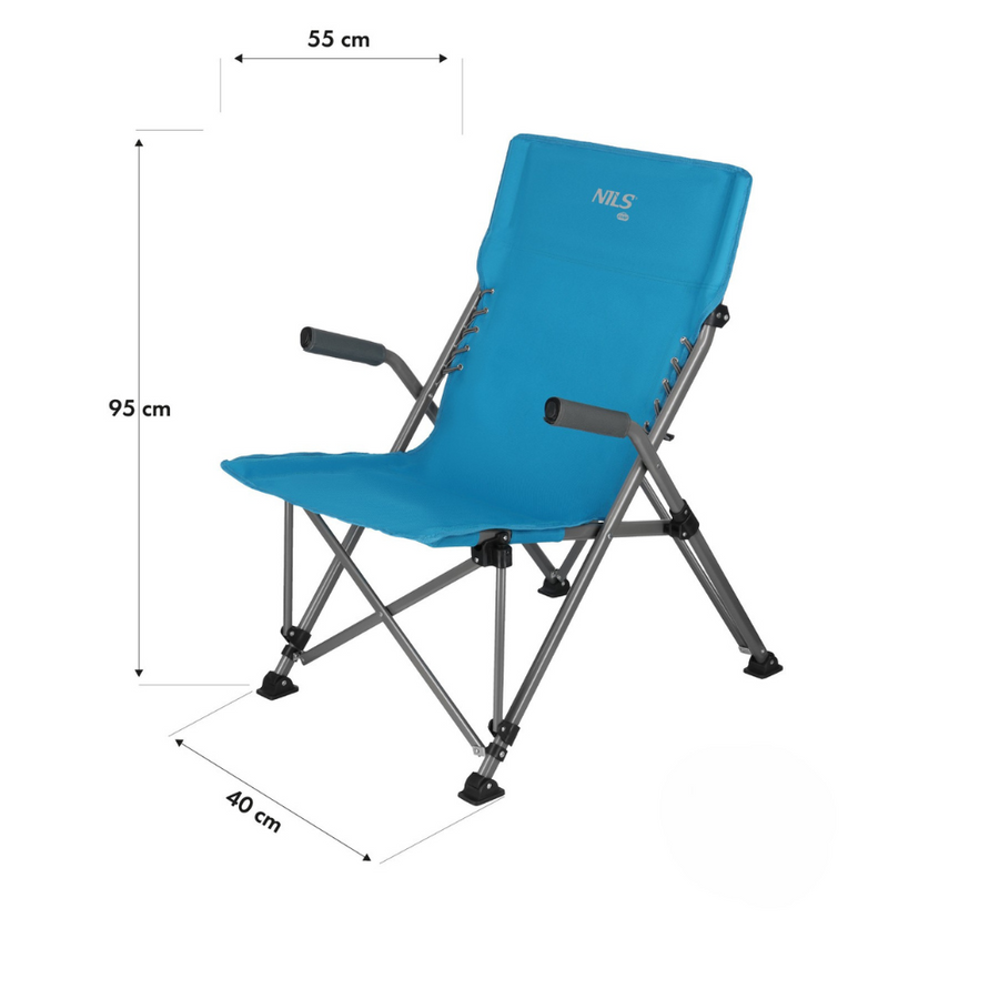 Szerokość siedziska to 40 cm, długość 55 cm, a wysokość oparcia 95 cm.