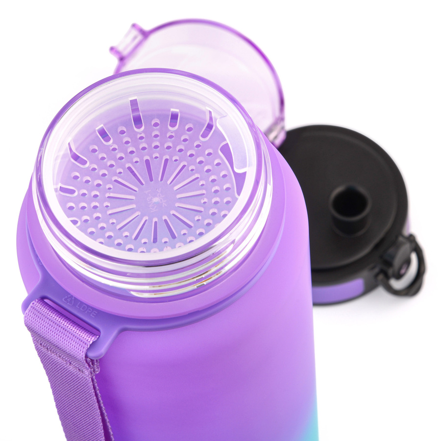 Duży otwór ułatwia szybkie napełnianie, a wygodny ustnik zapewnia płynny przepływ bez potrzeby ściskania butelki. Matowe wykończenie oraz antypoślizgowa powierzchnia zapewniają wygodny chwyt. Pasek na nadgarstek ułatwia codzienne użytkowanie. Wyjmowany filtr umożliwia dodanie owoców, herbaty lub kostek lodu bez ryzyka zatkania ustnika, a wewnętrzna miarka zachęca do regularnego nawadniania.
