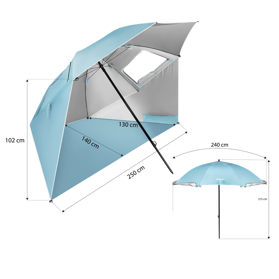 NC17114 marki NILS CAMP to niezwykle funkcjonalny parasol 2 w 1, który dzięki bocznym ściankom może pełnić również funkcję parawanu. Zapewnia skuteczną ochronę przed słońcem, wiatrem i piaskiem, tworząc komfortową strefę wypoczynku – zarówno na plaży, jak i w ogrodzie czy na kempingu. Dzięki odpinanej podłodze, praktycznym dodatkom i kompaktowej formie, jest idealnym towarzyszem letniego relaksu.