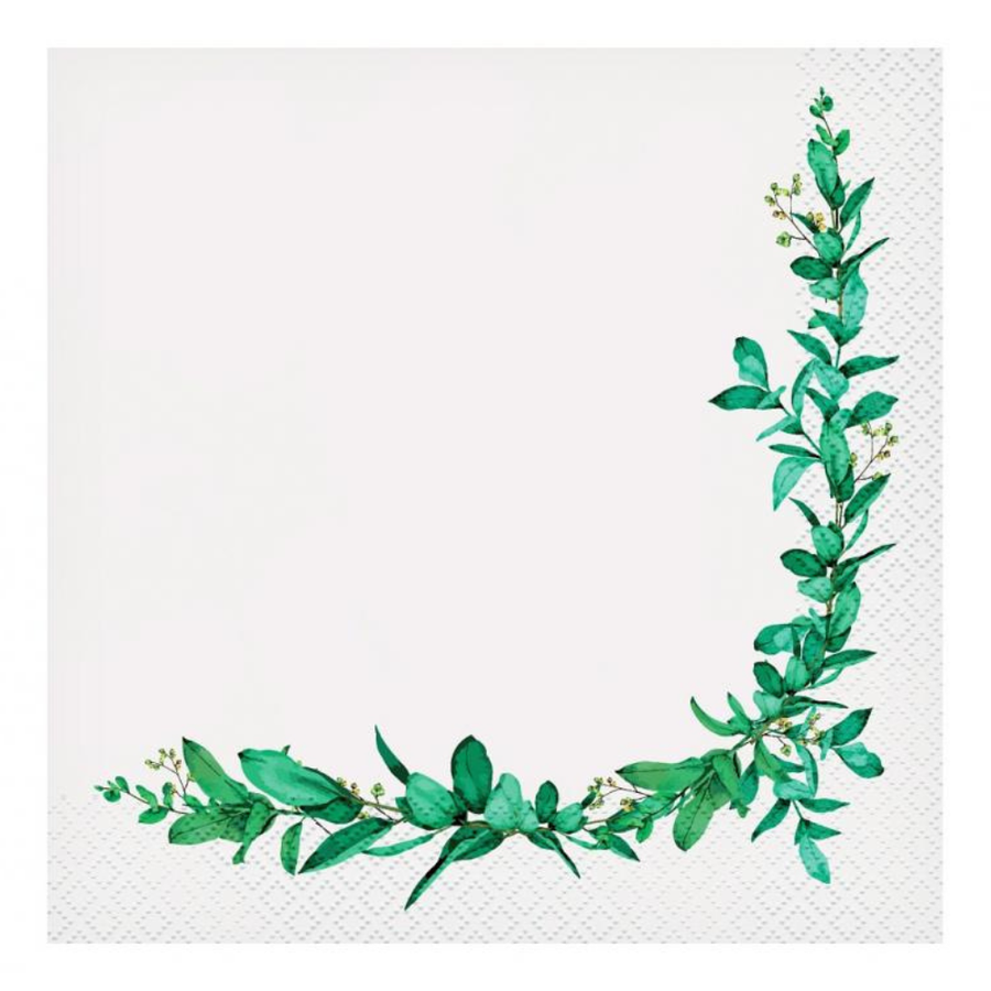 Serwetki utrzymane są w eleganckiej kolorystyce – białe tło z nadrukiem zielonych liści, które dodają świeżości i naturalnego uroku.