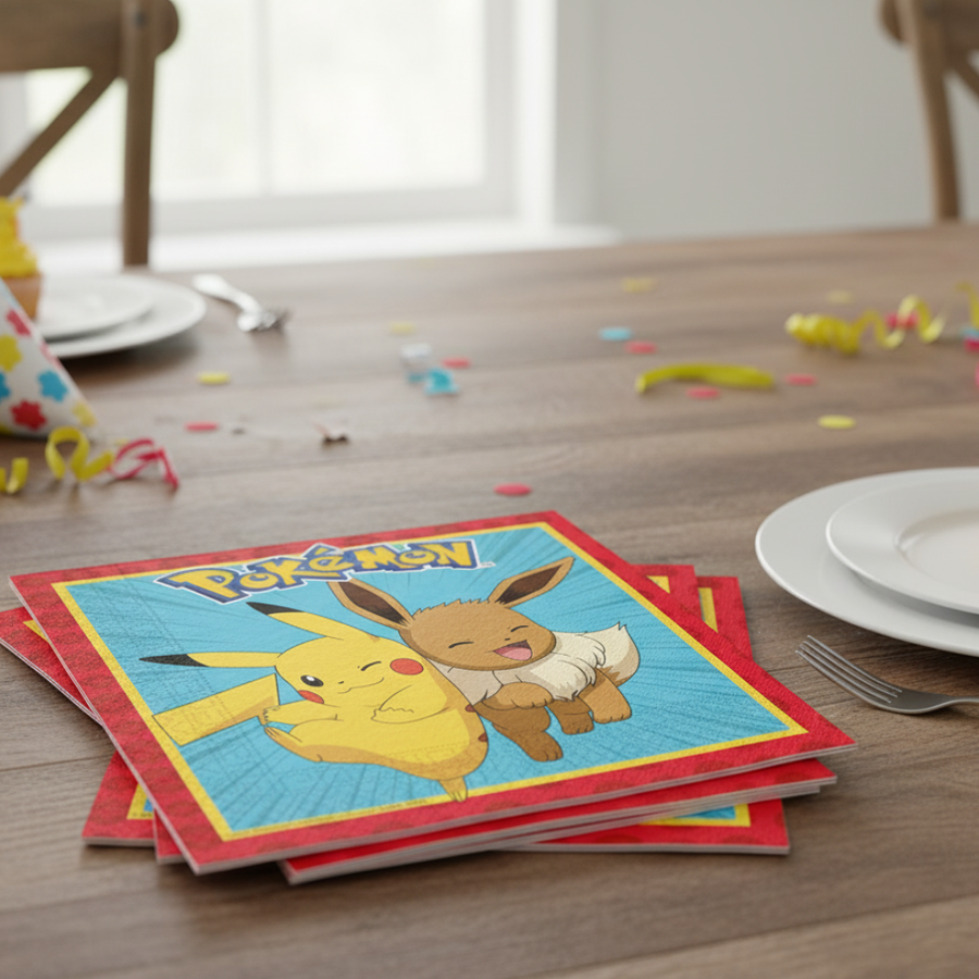 Wprowadź do swojego przyjęcia odrobinę magii i energii z ulubionego świata Pokémon! Te papierowe serwetki Pokémon to idealny dodatek na dziecięce urodziny, imprezy tematyczne czy pikniki. Barwny nadruk z postaciami znanymi z popularnej serii zachwyci najmłodszych i doda stołowi wyjątkowego, radosnego charakteru.