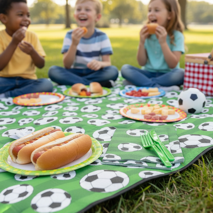 - Sportowy motyw – kolorowy wzór z piłką nożną idealnie wpisuje się w tematykę sportowych przyjęć.