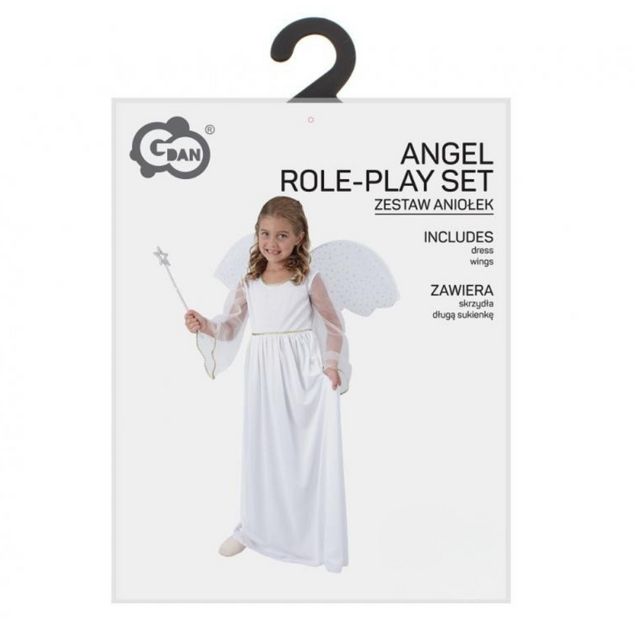 W komplecie znajduje się biała sukienka z ozdobami, para lekkich skrzydeł oraz aureola na elastycznej opasce.