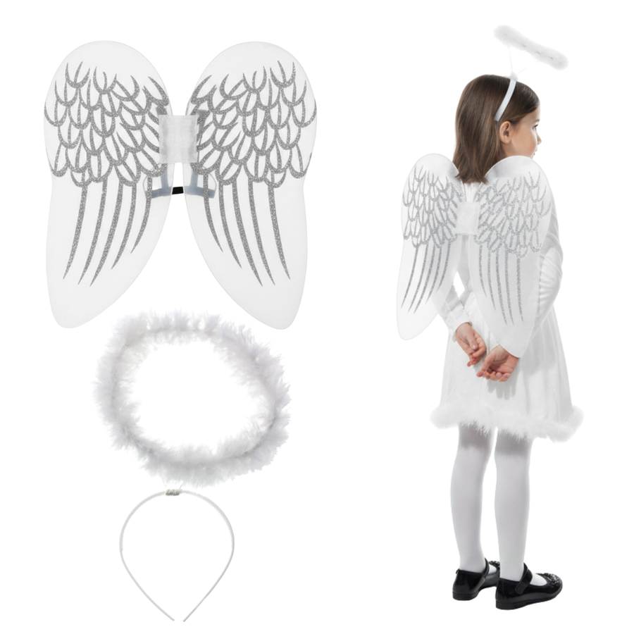 - Kompletny zestaw – skrzydełka z brokatem i aureola w klasycznym, anielskim stylu.