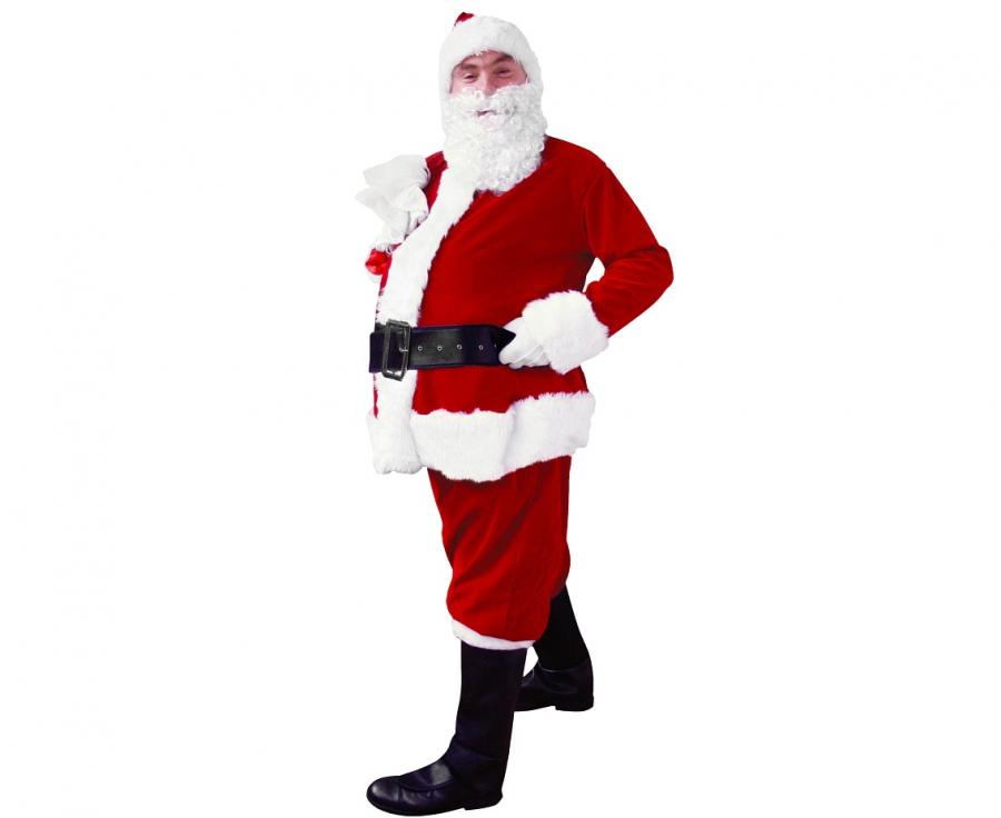 W komplecie znajdują się: bluza, spodnie, nakładki na buty, pasek, czapka, rękawiczki oraz biała broda.